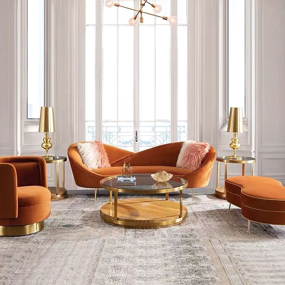 أضف لمسة من التألق والحداثة إلى ديكور منزلك مع هذه الأريكة المخملية البرتقالية ذات التصميم المنحني الفريد. يجمع ظهرها المنحني الأنيق بين الجمالية العصرية والراحة الفائقة، مما يجعلها قطعة ديكور محورية تجذب الأنظار وتضيف دفئًا إلى أي غرفة.