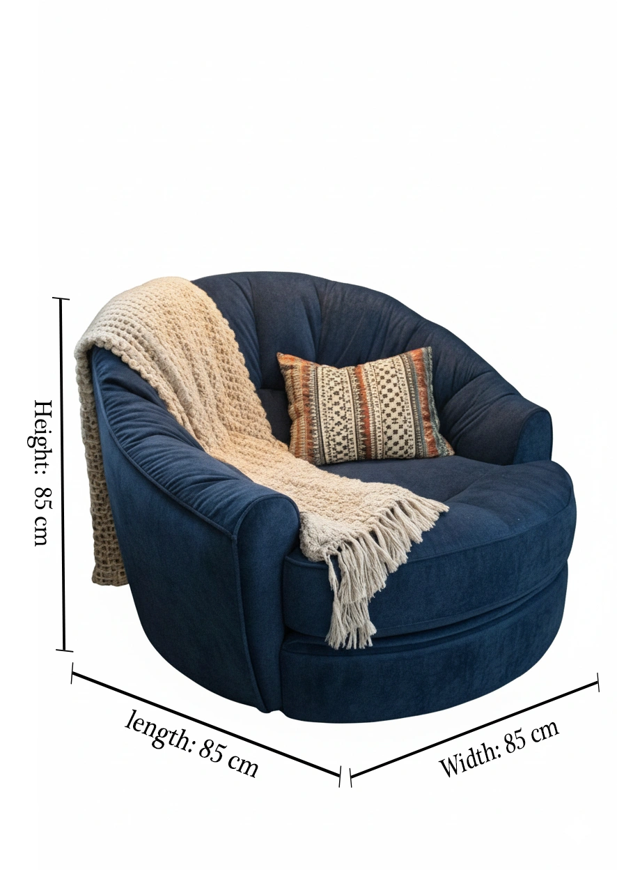 كرسي أزورا من LIVING بتصميم دائري فخم يجمع بين الأناقة والراحة.مصنوع من قماش قطيفة ناعم باللون الأزرق الداكن مع وسادة زخرفية أنيقة تضيف لمسة دفء وعصرية لأي مساحة.الأبعاد: الطول 85 سم × العرض 85 سم × الارتفاع 85 سم