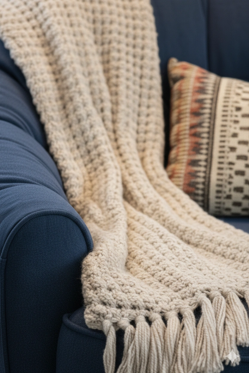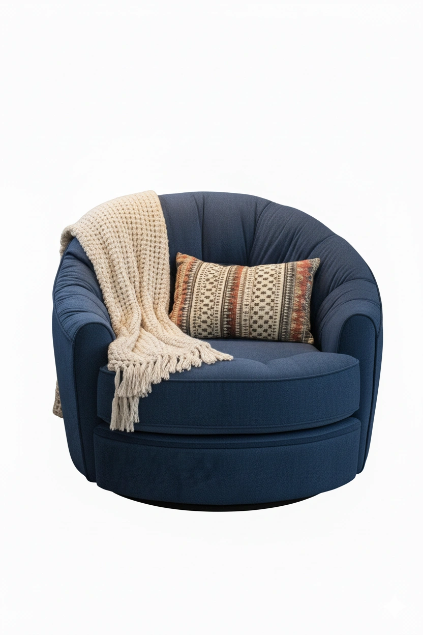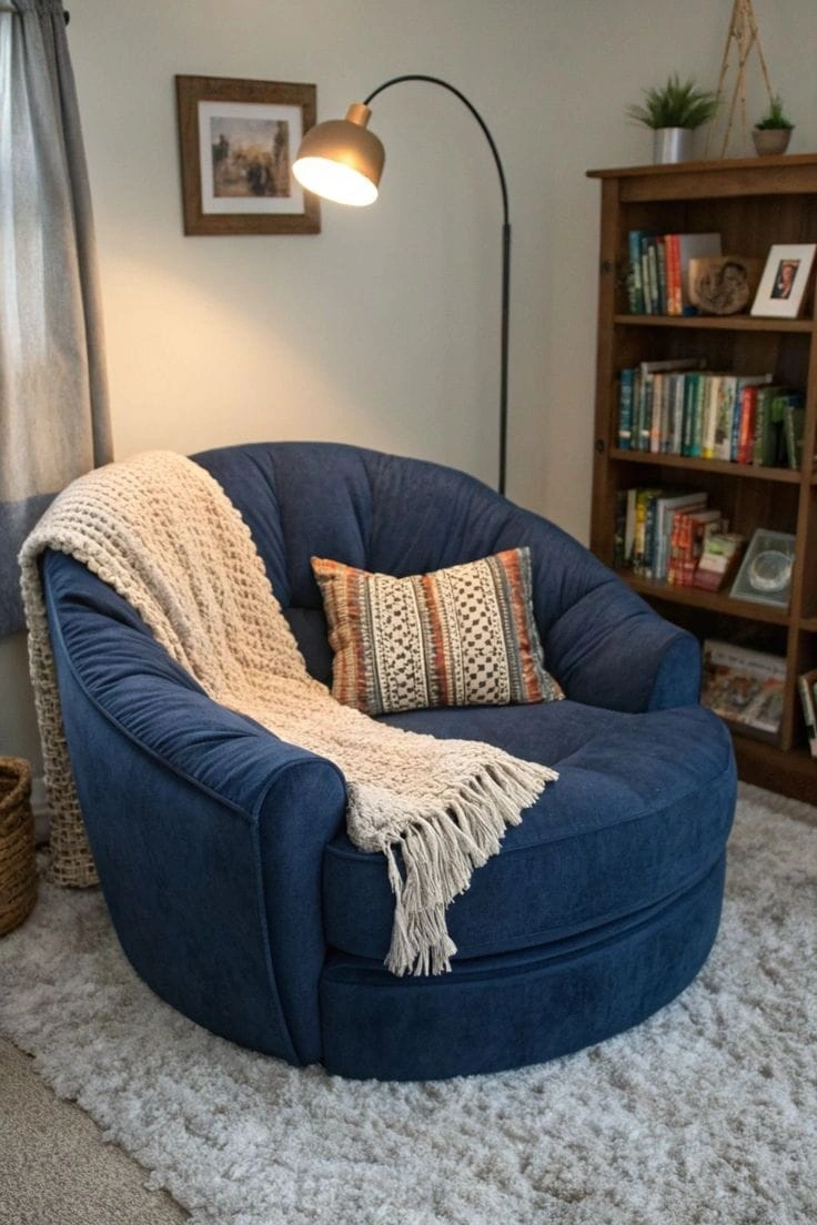 اللون الأزرق الداكن يعطي إحساسًا بالهدوء والفخامة، بينما تضيف الوسادة الزخرفية لمسة فنية دافئة.