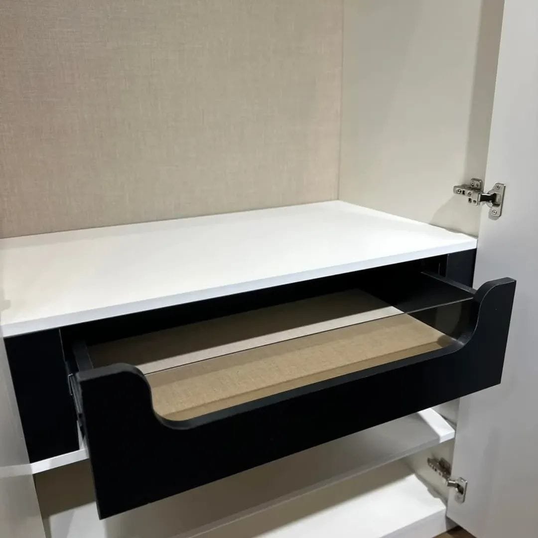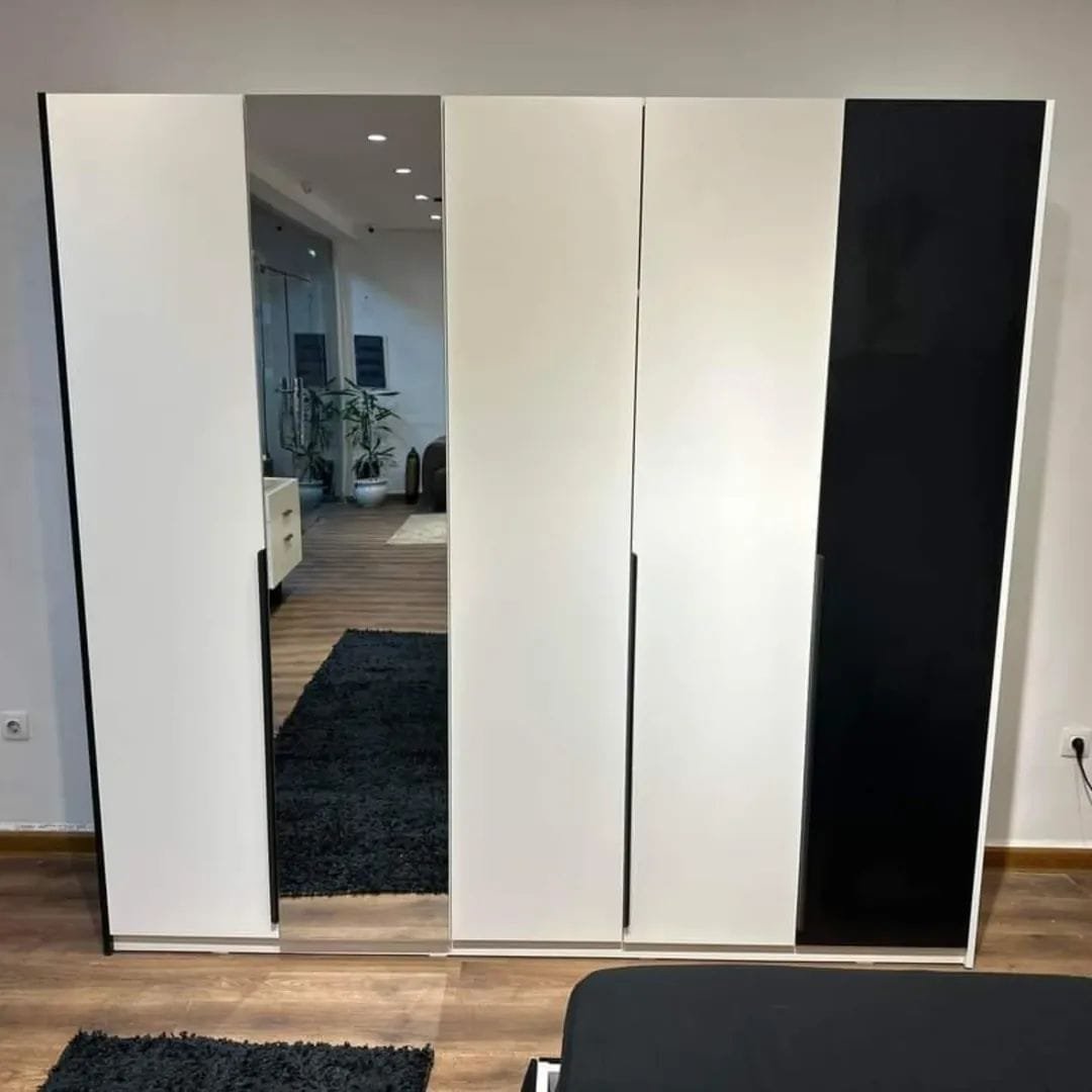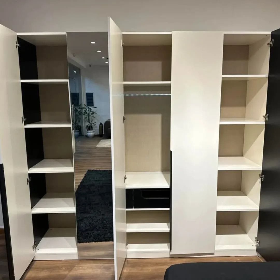 • الدولاب واسع مزود بمرآة كبيرة وأرفف متعددة التنظيم.