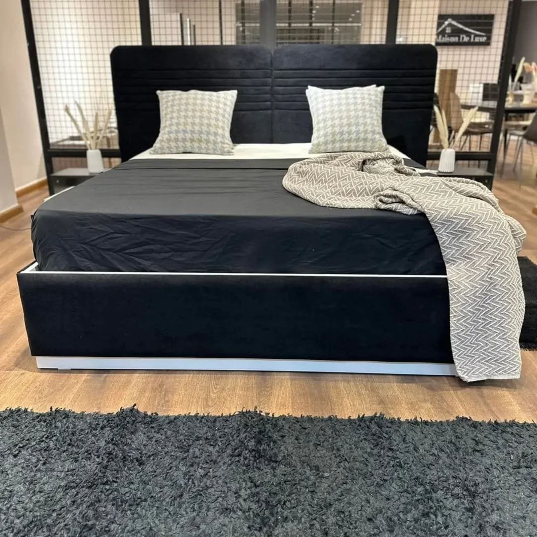 • السرير مزود بآلية رفع للتخزين الذكي وتصميم مبطن فخم باللون الأسود.