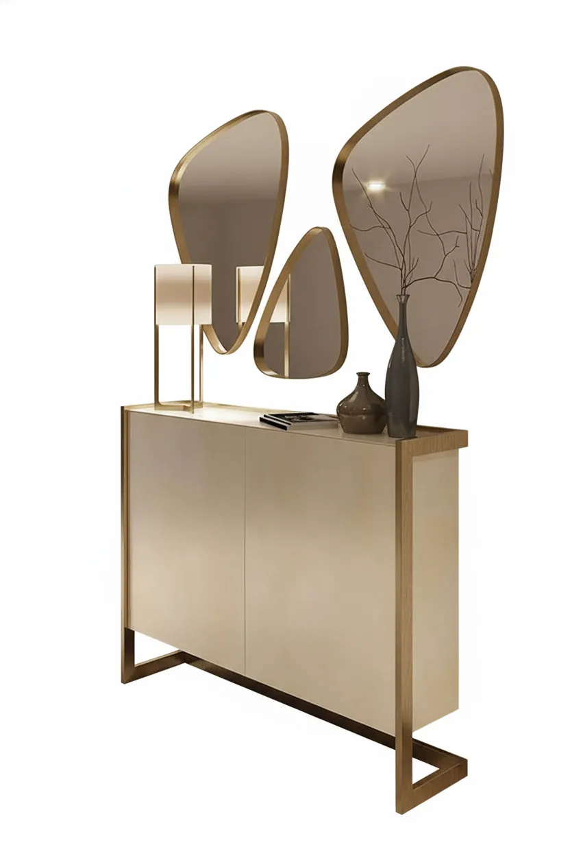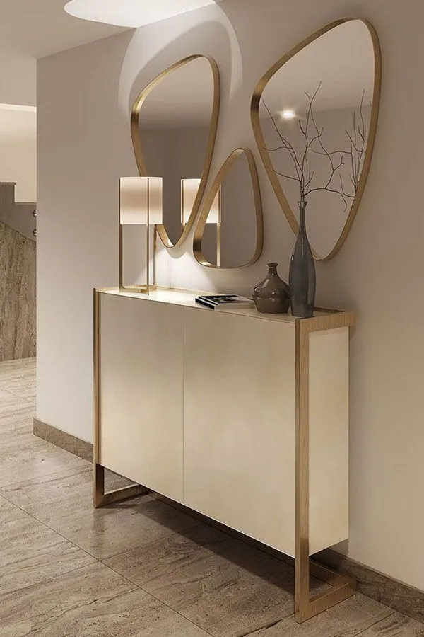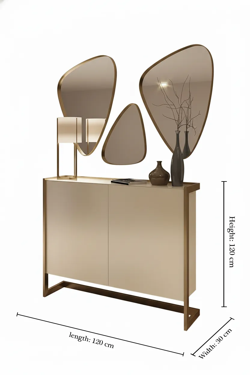 يأتي مزودًا بمرآة ثلاثية الشكل بإطار ذهبي تضيف لمسة فنية ساحرة على الجدار وتزيد من إحساس الاتساع في المكان.