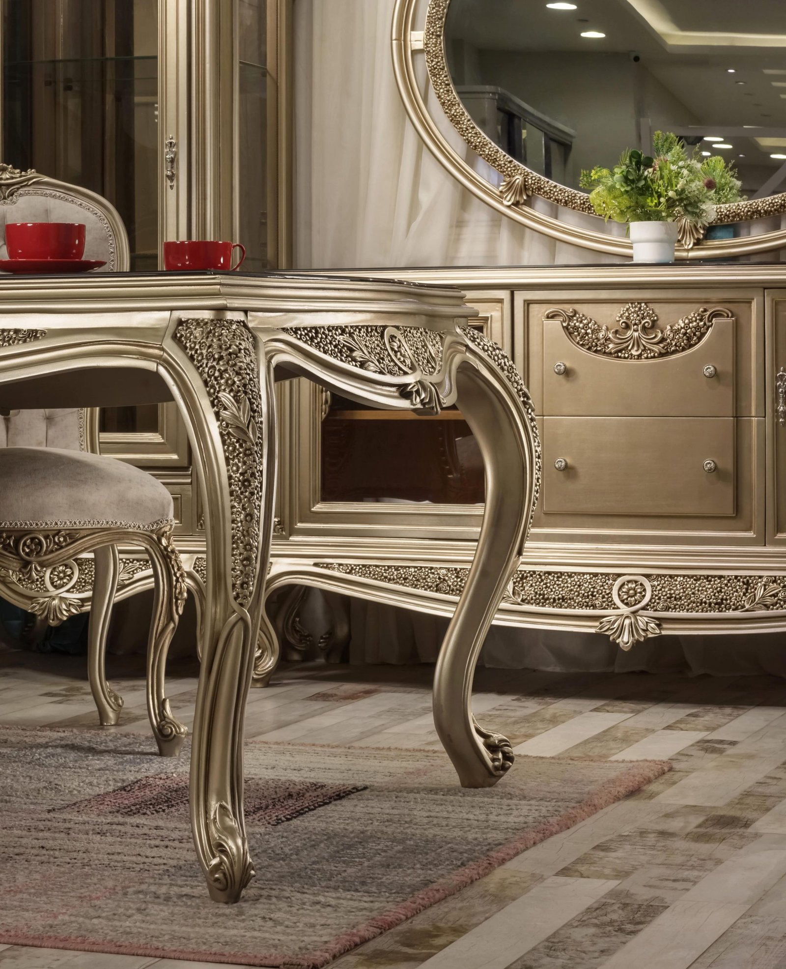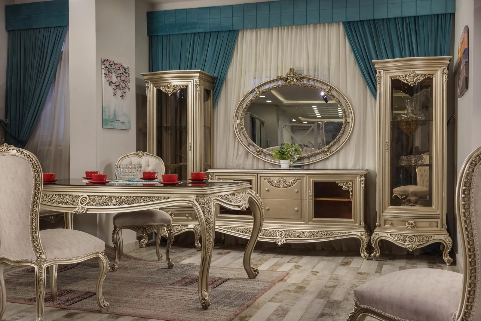 سفرة أليساندرا هي اختيار مثالي لمن يبحث عن الفخامة الكلاسيك الخالدة مع لمسة عصرية راقية. تتميز بتصميم غني بالتفاصيل المنحوتة يدويًا، مع أرجل منحنية وزخارف بارزة تعكس الطابع الملكي الأصيل.
