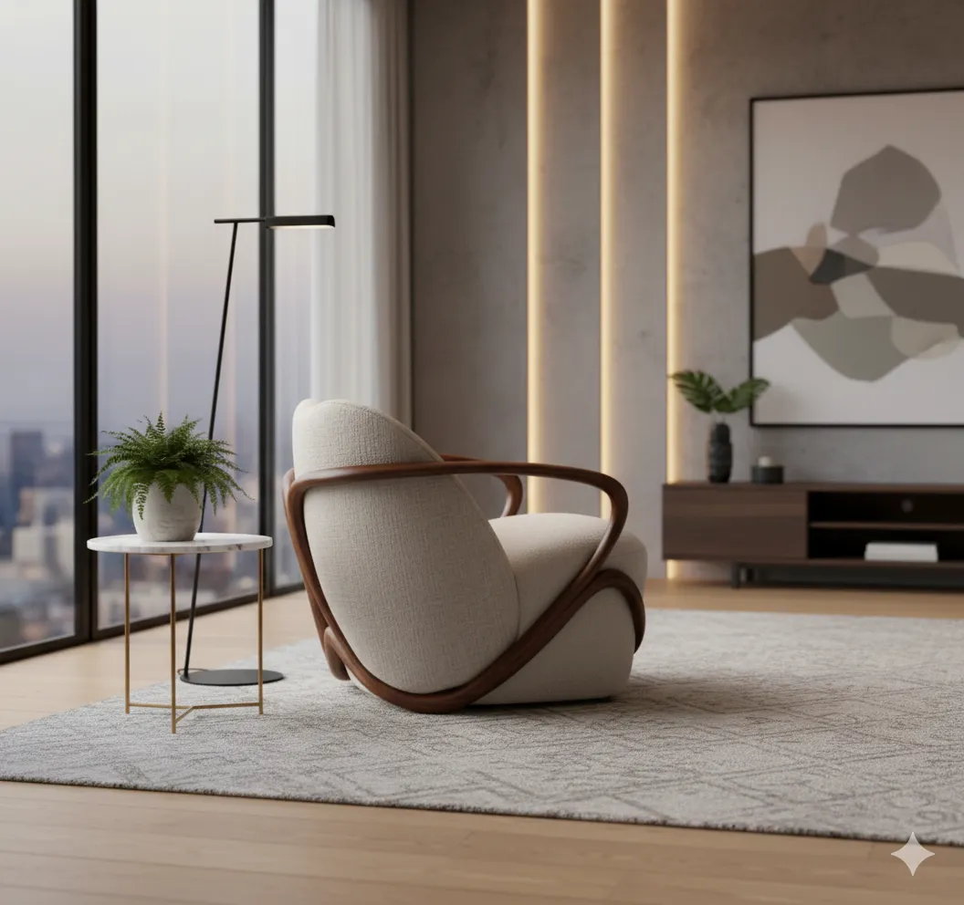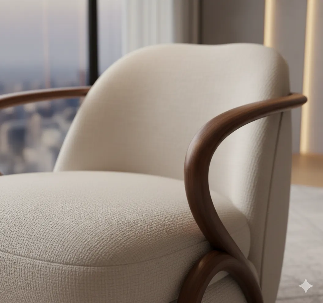 يتميّز الكرسي بانحناءات خشبية ناعمة تحيط بالمقعد، مما يخلق مظهرًا فنيًا فريدًا يجمع بين الحداثة والرقي.