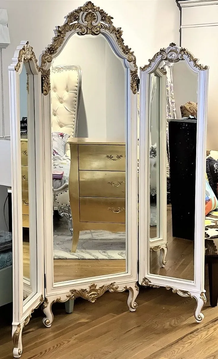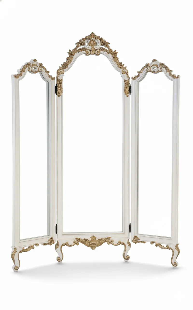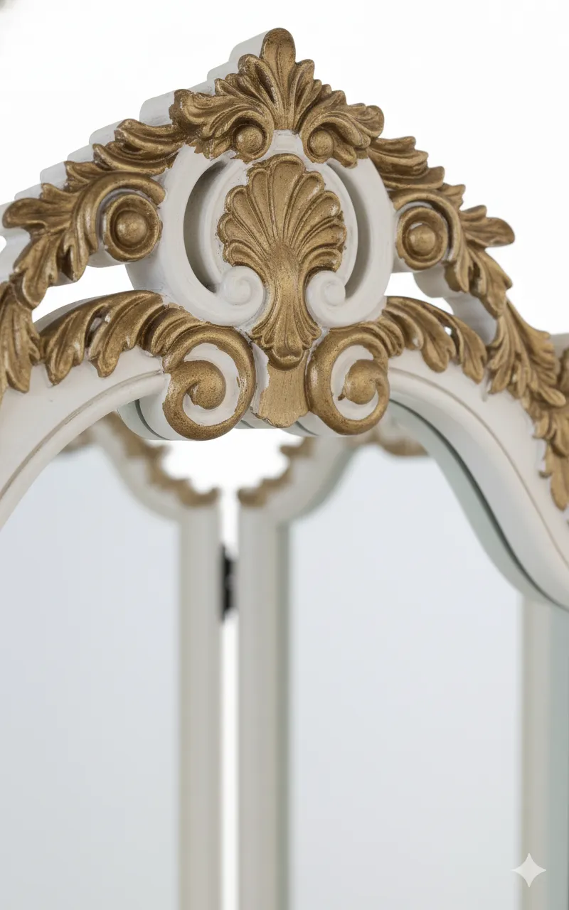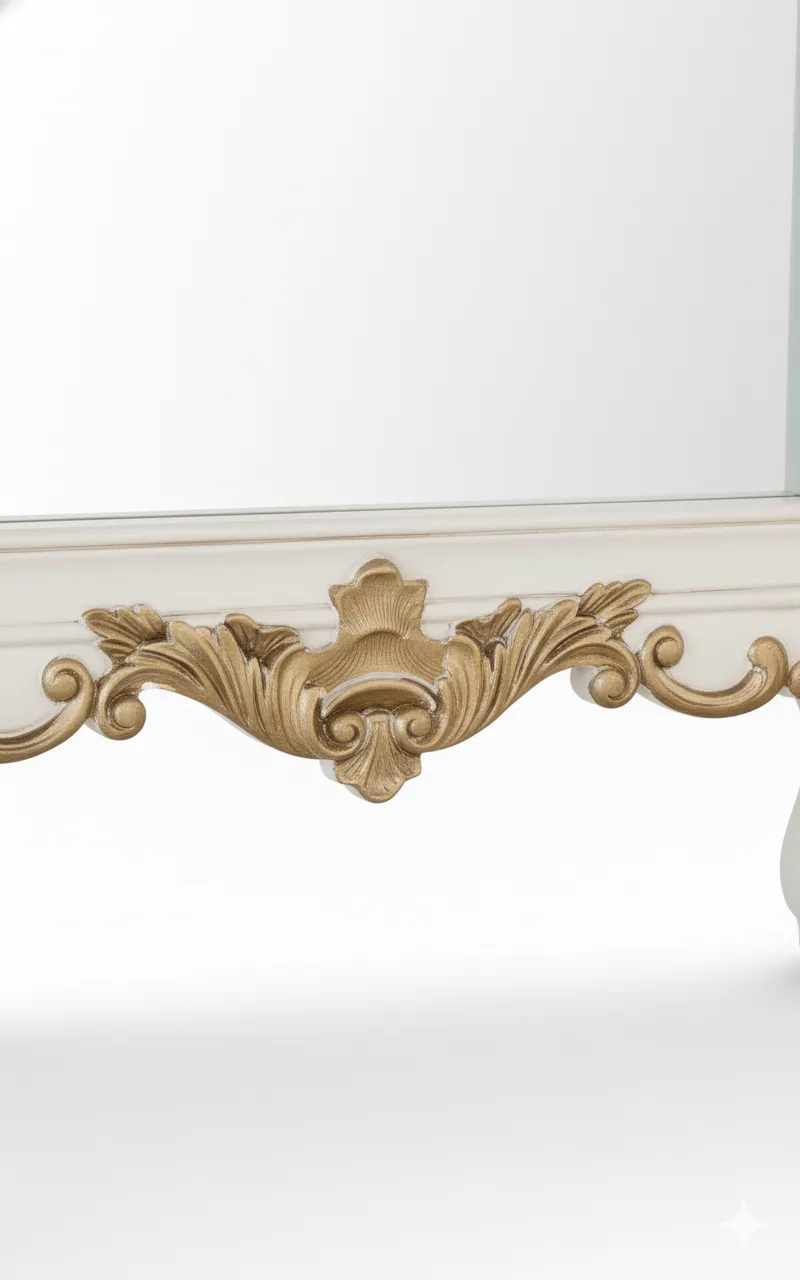 الإطار مصنوع بتفاصيل زخرفية دقيقة ولمسات ذهبية فاخرة تضيف طابعًا ملكيًا مميزًا، مع مرايا عالية الجودة تعكس الضوء بشكل مثالي.