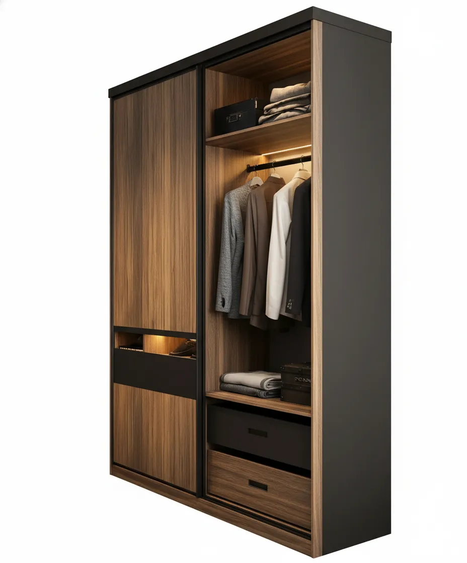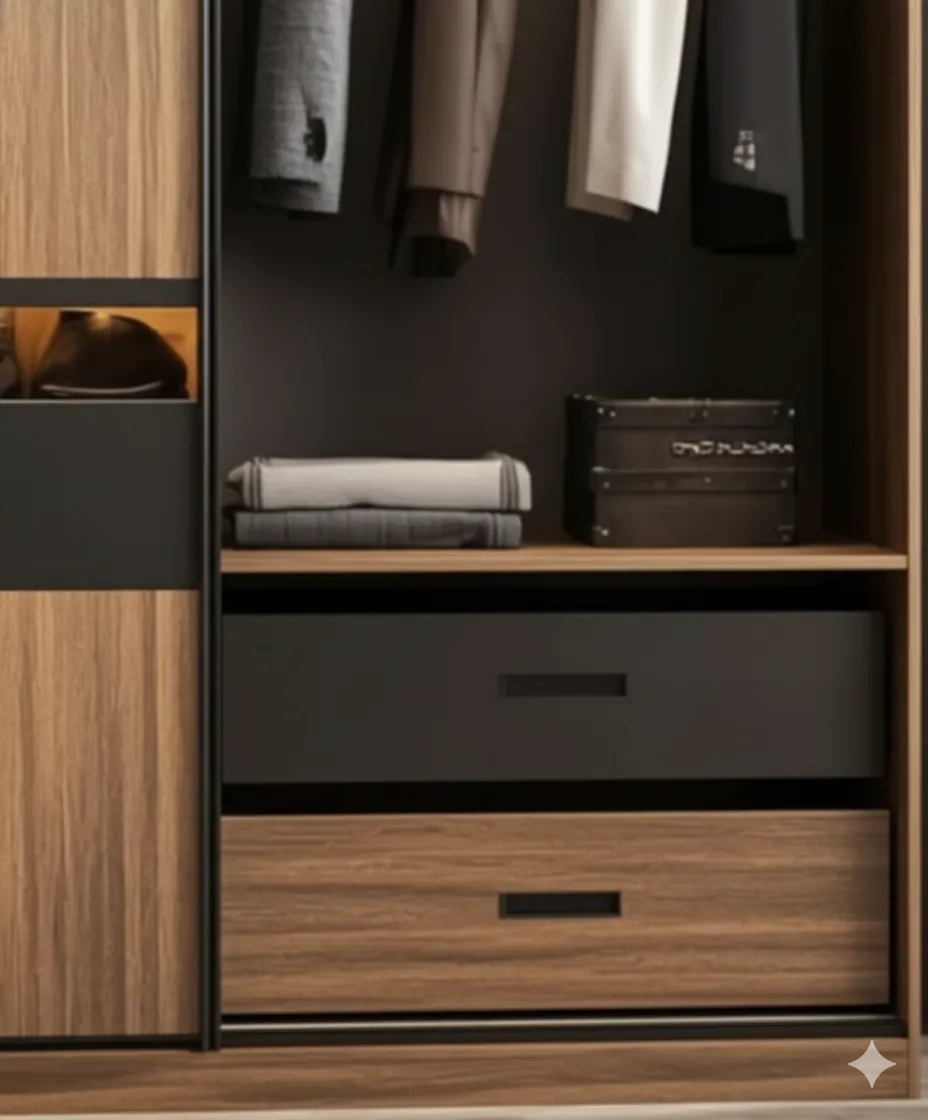 التصميم الخارجي يجمع بين خامة الخشب الطبيعية واللمسات السوداء لإحساس فخم ومودرن، مما يجعلها مناسبة لمختلف أنماط الديكور، مع أبواب سحاب انسيابية توفّر مساحة في الغرفة.