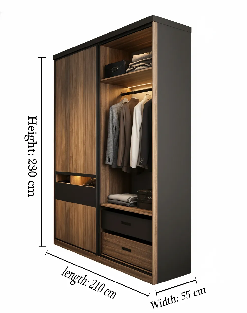 خزانة ملابس مودرن بأبواب سحاب بتصميم عملي وعصري، مقاس 210×55×230 سم، وتحتوي على مساحة تعليق واسعة، أرفف تخزين، ودرجين سفليين بلمسة خشبية أنيقة.