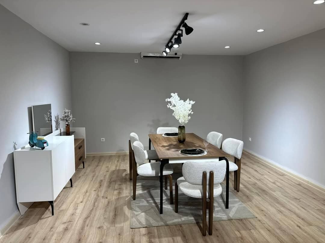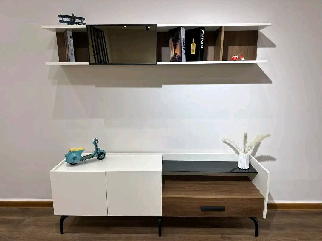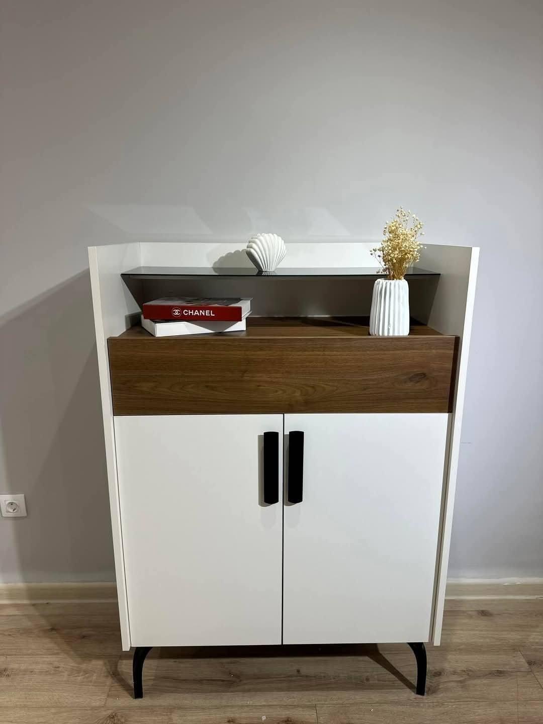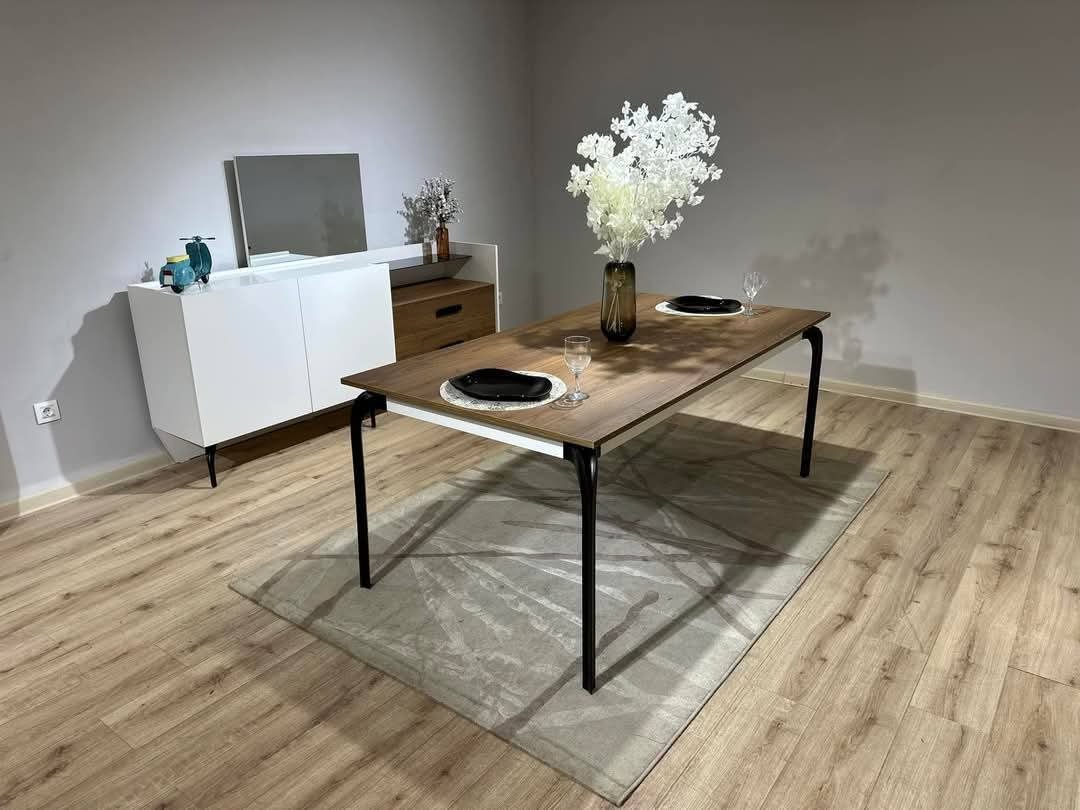 تتميز بتصميم أنيق يجمع الخشب الطبيعي مع اللمسات البيضاء والمعدن الأسود لإطلالة معاصرة تلائم مختلف ديكورات المنازل الحديثة.