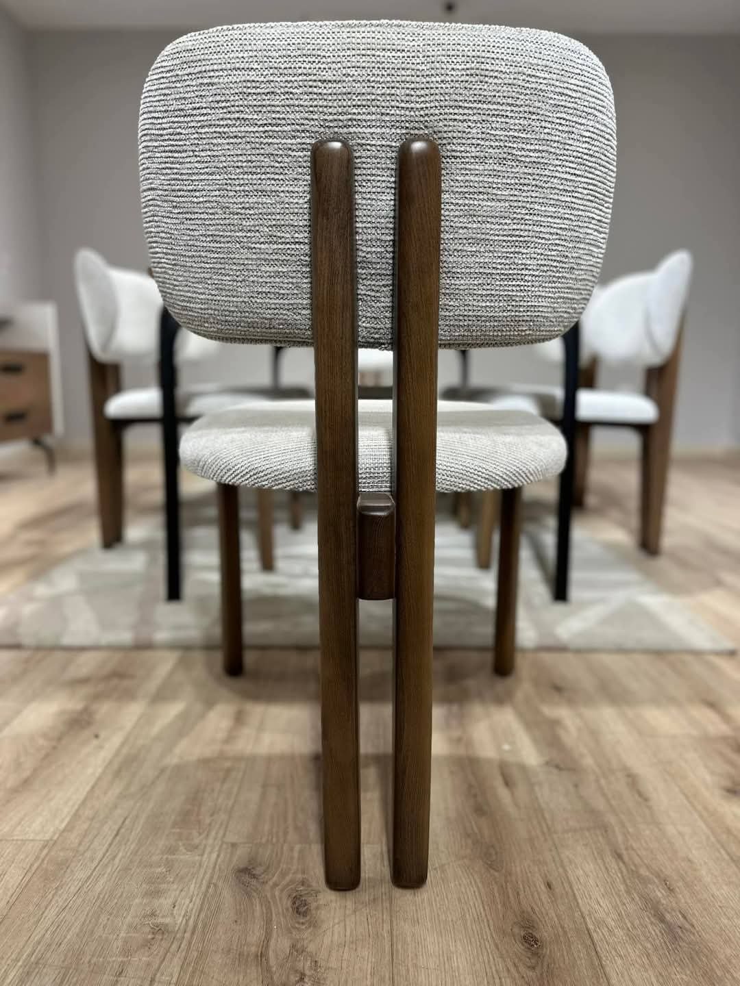 الكراسي مبطنة بقماش ناعم بدرجات فاتحة لمظهر دافئ ومريح.