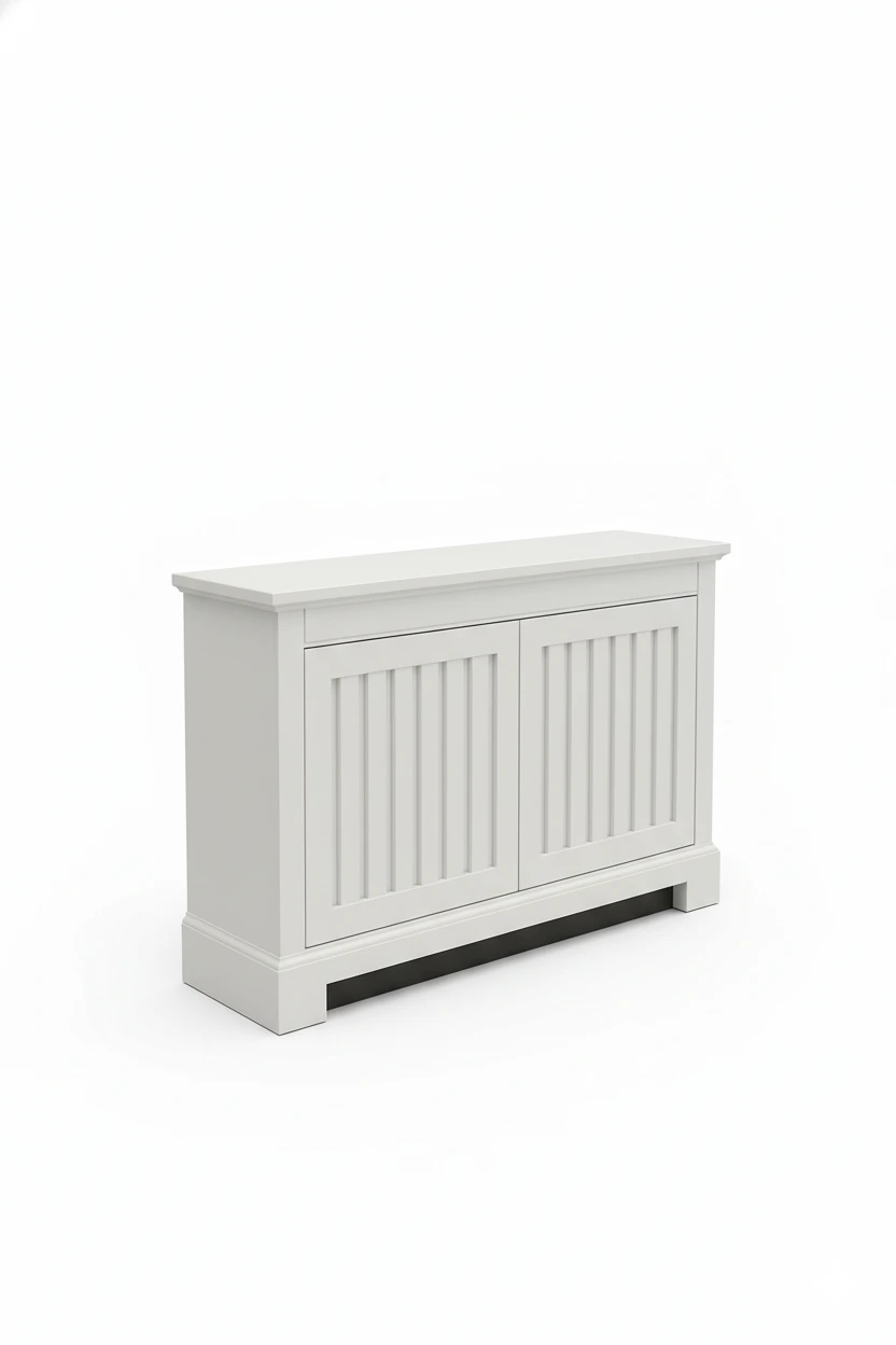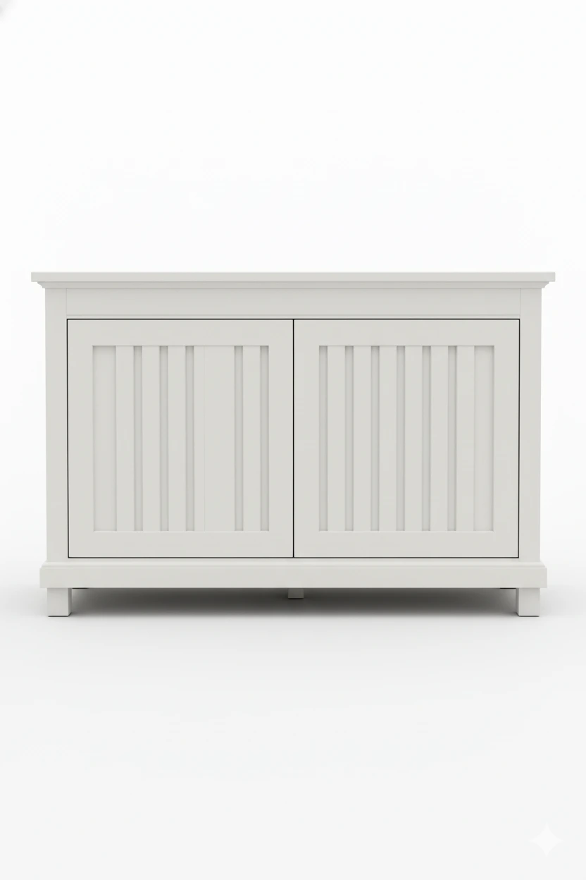 يتميز التصميم بخطوط رأسية منحوتة على الأبواب تعكس روح الفخامة والبساطة الكلاسيكية، بينما يمنح اللون الأبيض لمسة من الصفاء والاتساع للمساحة.