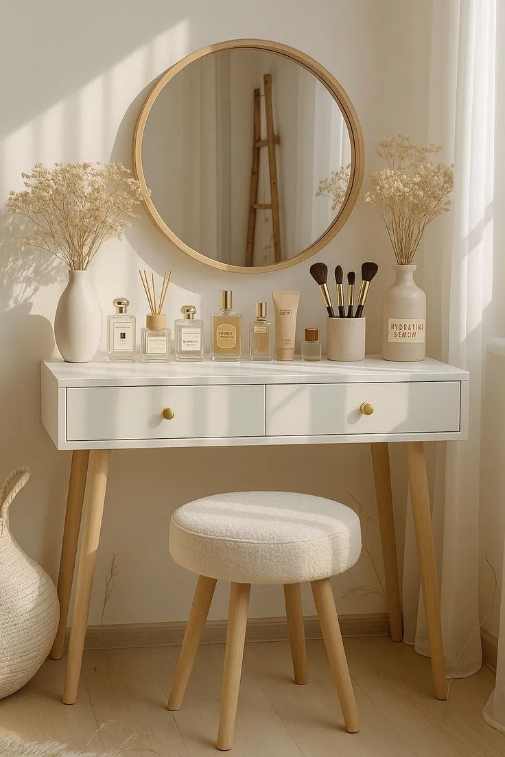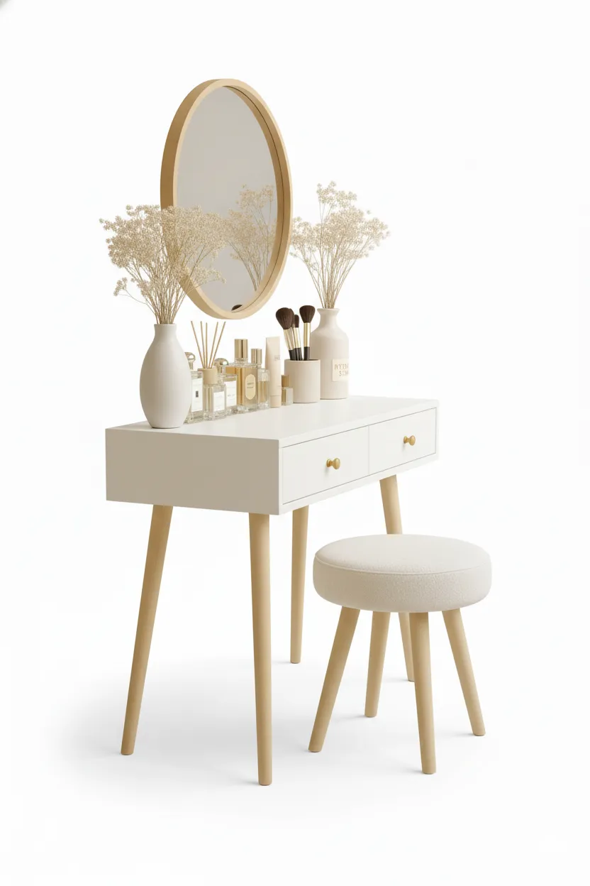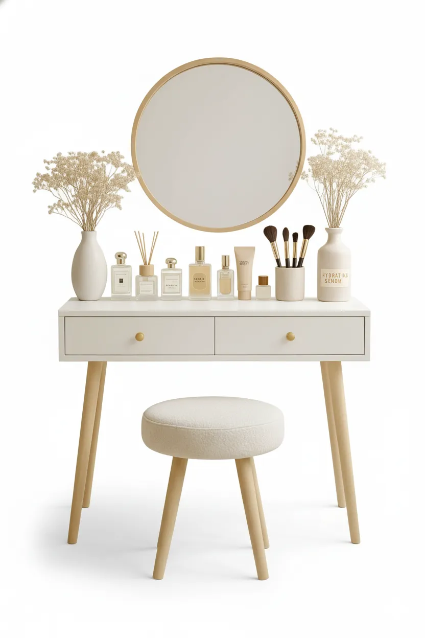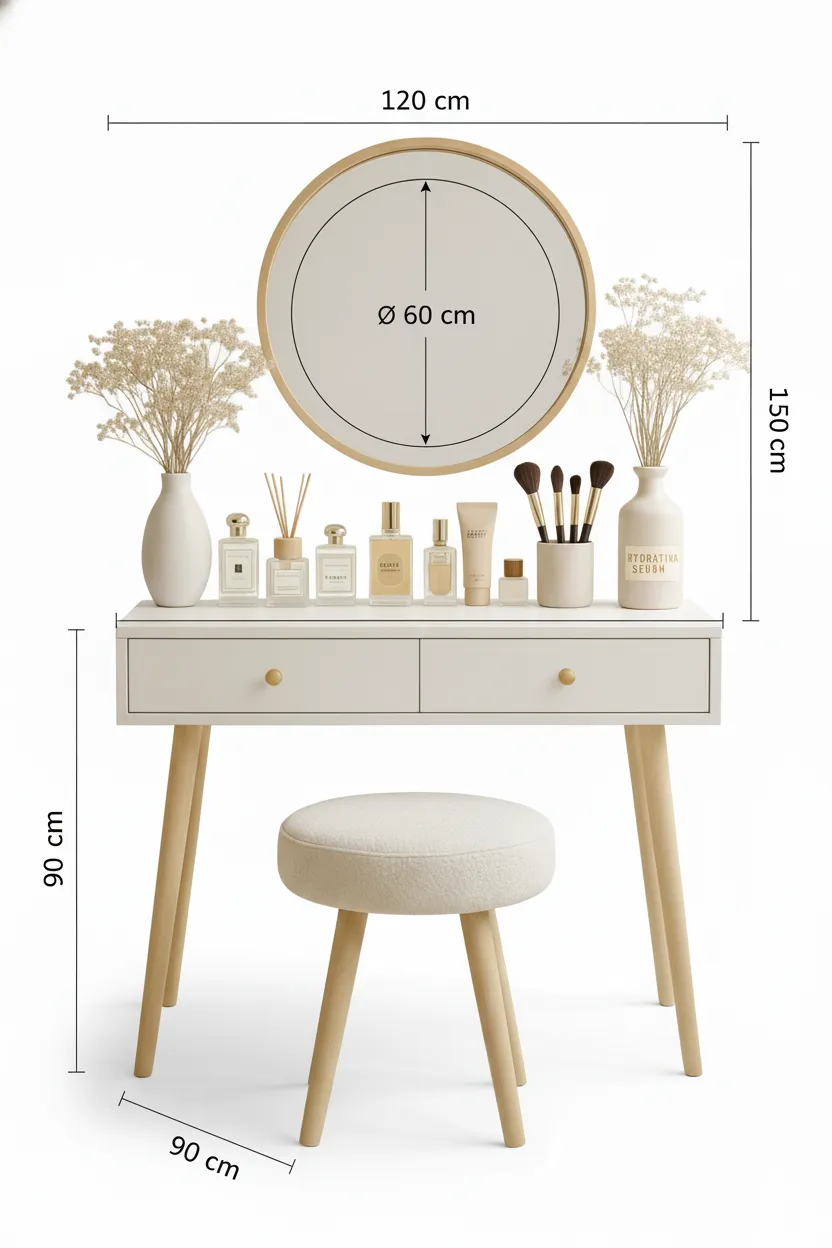 تسريحة مكياج أنيقة بتصميم مودرن باللون الأوف وايت مع أرجل خشبية طبيعية تضيف لمسة دفء وهادئة للمساحة.مزودة بمرآة دائرية قطرها 60 سم ودرجين للتخزين العملي، بأبعاد:العرض 120 سم × العمق 40 سم × الارتفاع 90 سم (حتى سطح الطاولة) – إجمالي ارتفاع مع المرآة 150 سم.