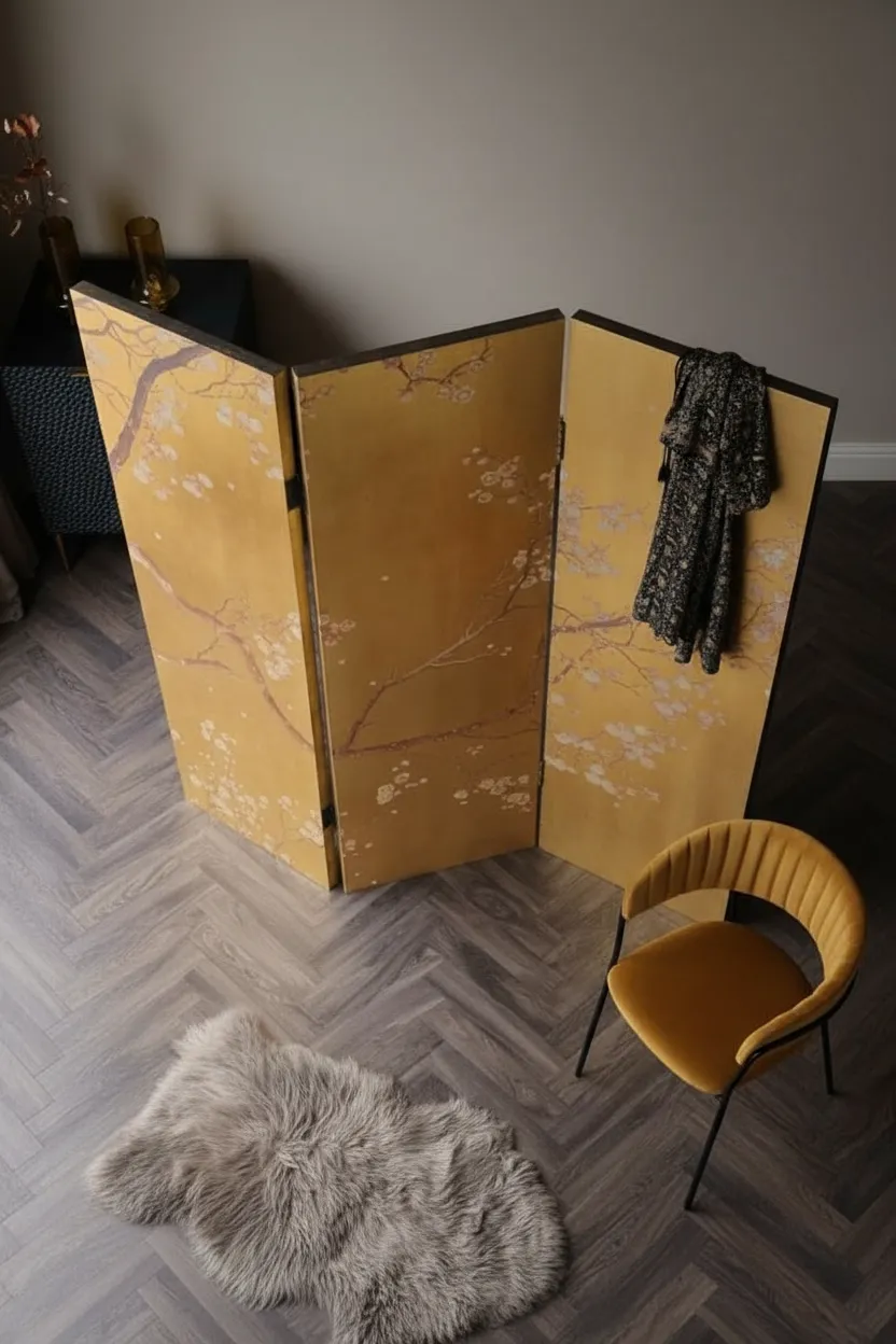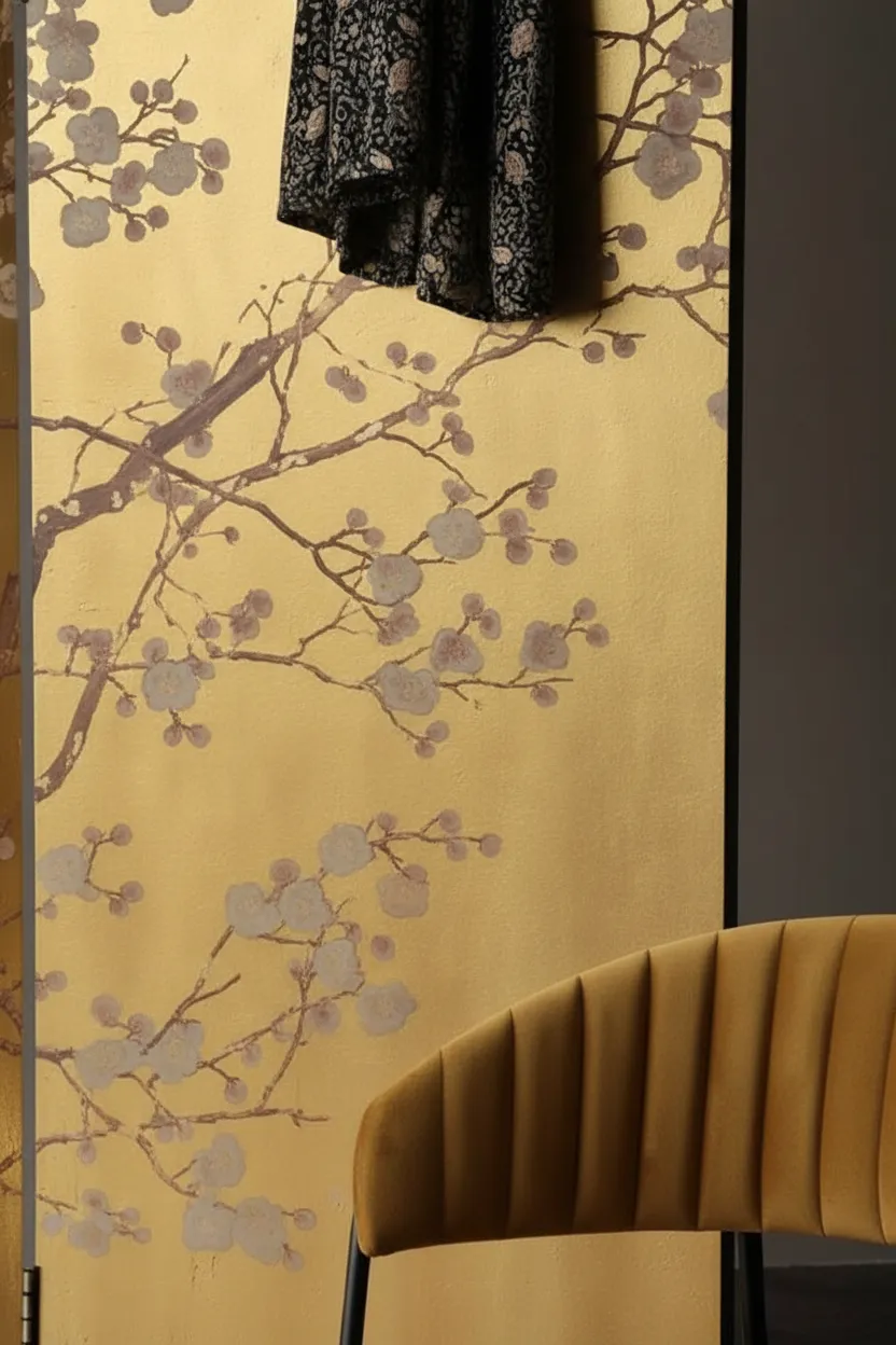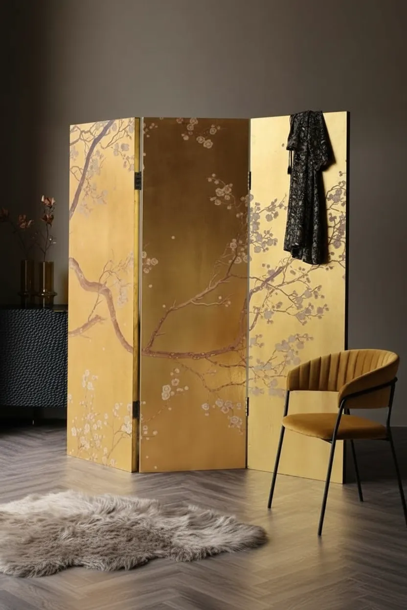 برافان أوريزا هو قطعة ديكور راقية تجمع بين الفن والوظيفة في آن واحد. تصميمه الذهبي المشرق مع نقوش الأشجار والزهور المستوحاة من الأسلوب الياباني يجعله عنصرًا لافتًا داخل أي غرفة؛ سواء كانت غرفة نوم، صالة معيشة، ركن ملابس أو غرفة ضيوف.
