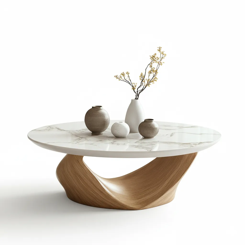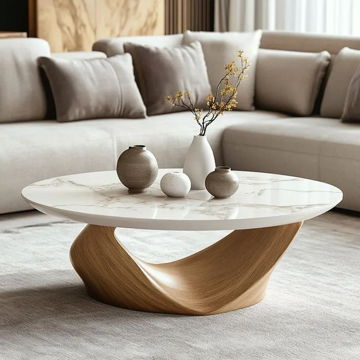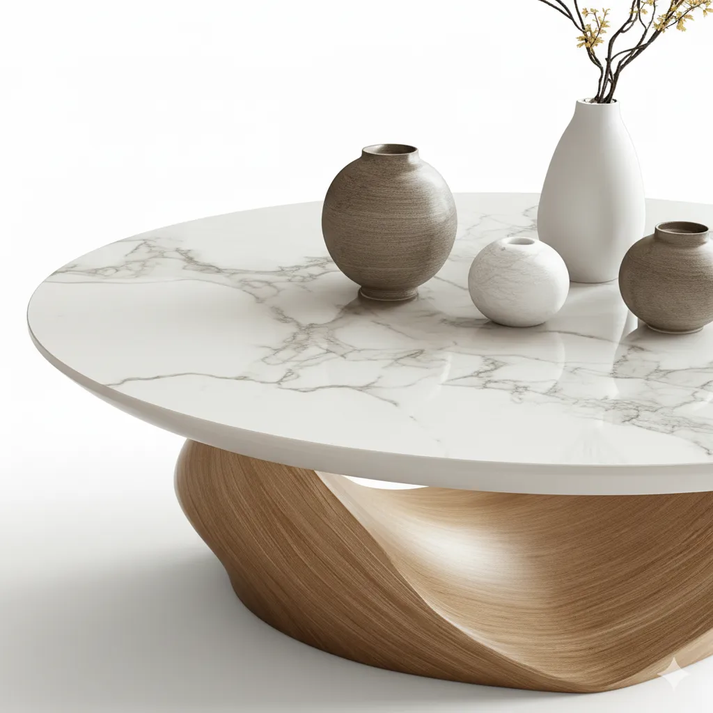 السطح الرخامي الدائري يمنح الطاولة مظهرًا راقيًا وسهل التنظيف، بينما القاعدة الخشبية المنحنية تضيف إحساسًا بالحركة والانسجام مع الديكورات العصرية والهادئة.