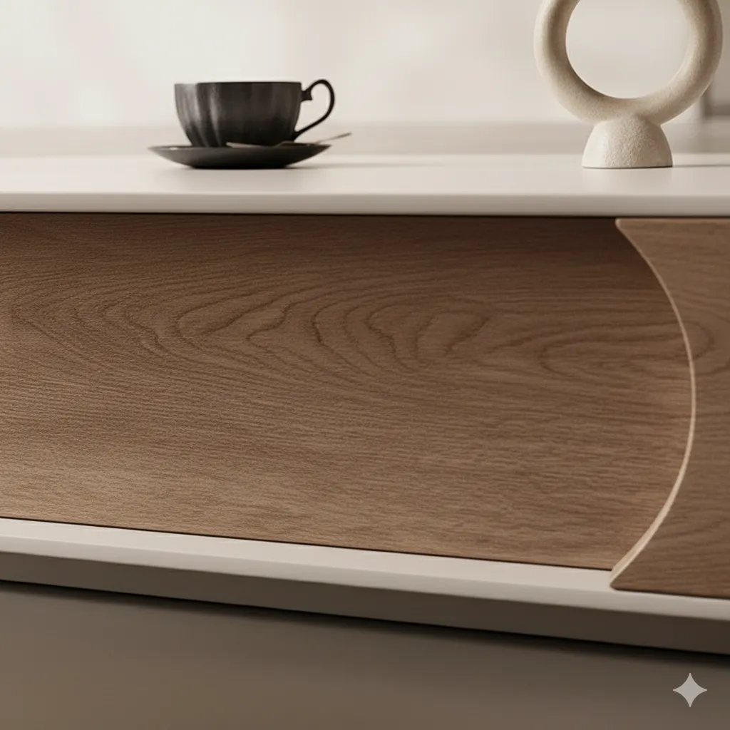 تعتمد على مزيج متوازن بين الخشب الطبيعي الدافئ والسطح الخارجي باللون الكريمي الهادئ، ما يجعلها قطعة مثالية للديكورات المودرن والهادئة.