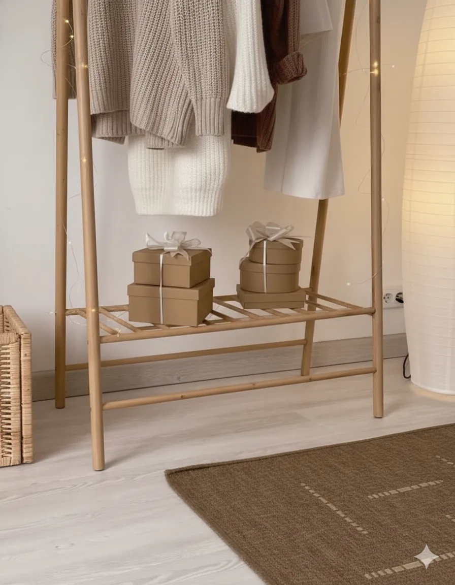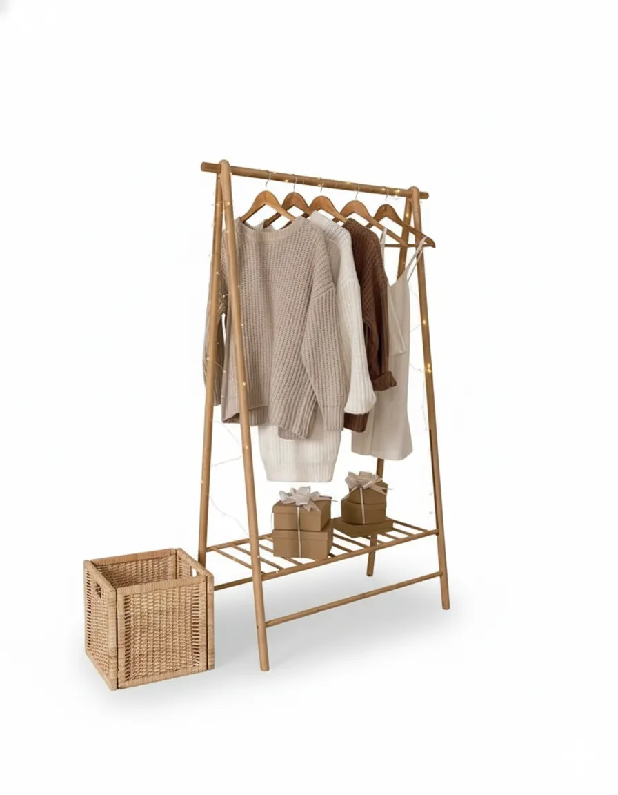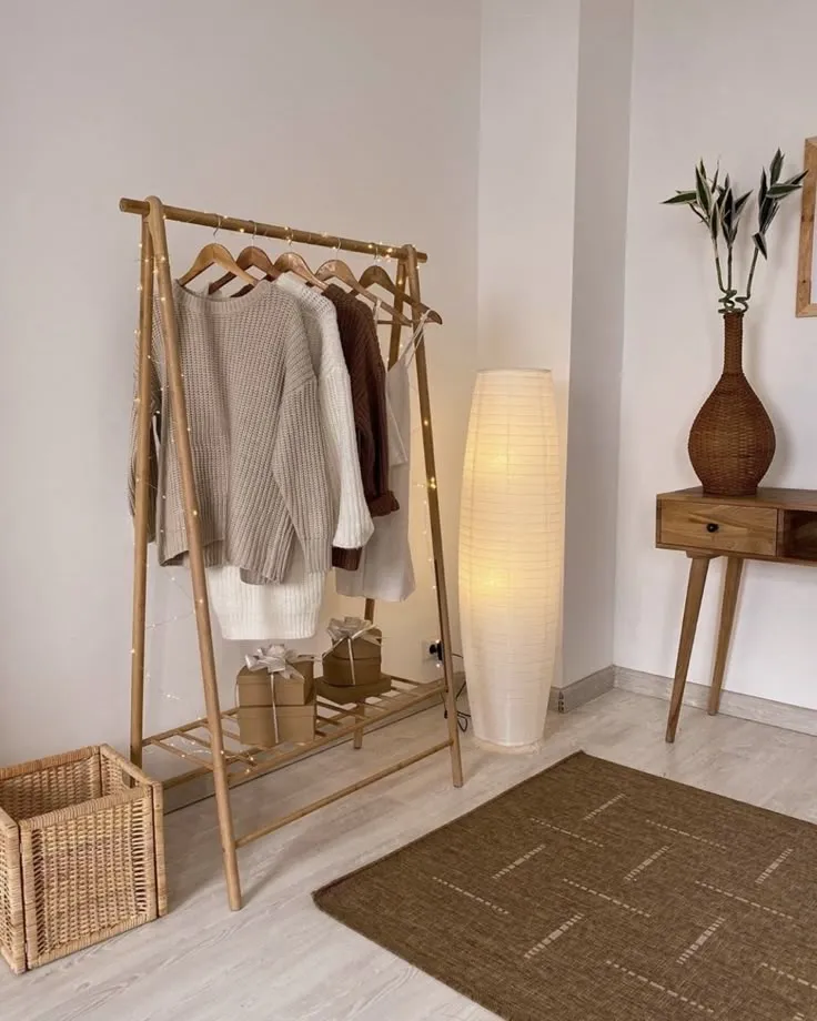 مصنوعة من خشب طبيعي فاتح اللون, تضيف دفئًا للمكان وتساعد على تنظيم الملابس اليومية أو التحضيرات السريعة.
