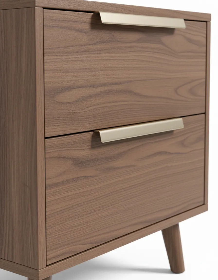 يتميز بتصميمه الانسيابي والمقابض المعدنية الراقية التي تضيف لمسة مودرن أنيقة، مما يجعله الخيار الأمثل لغرف النوم الراقية أو المساحات الجانبية في المنزل.