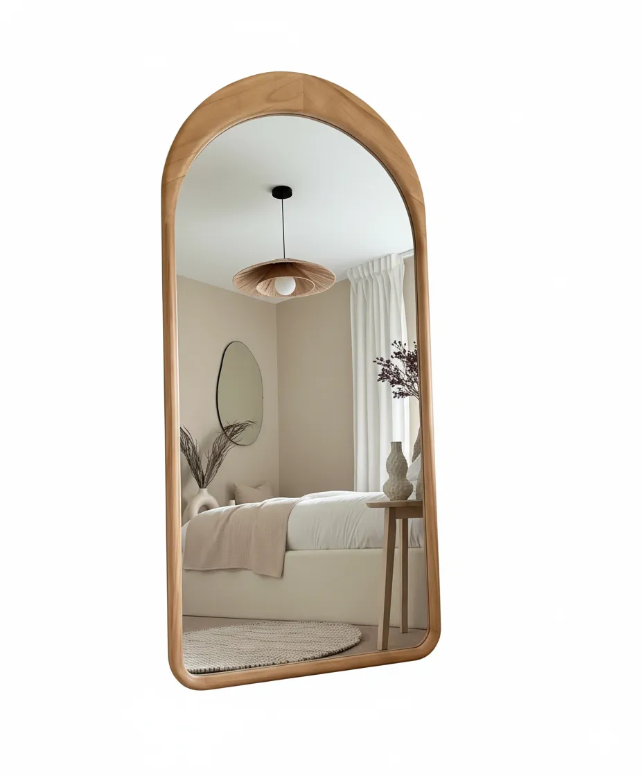 أوميليا مرايا أرضية بإطار خشبي مقوس من ليفينج. تصميم عصري فاخر يمنح عمق وأناقة للمكان، مع إطار خشبي ناعم يناسب ديكورات غرف النوم والملابس.الأبعاد: 210سم ارتفاع × 90سم عرض.