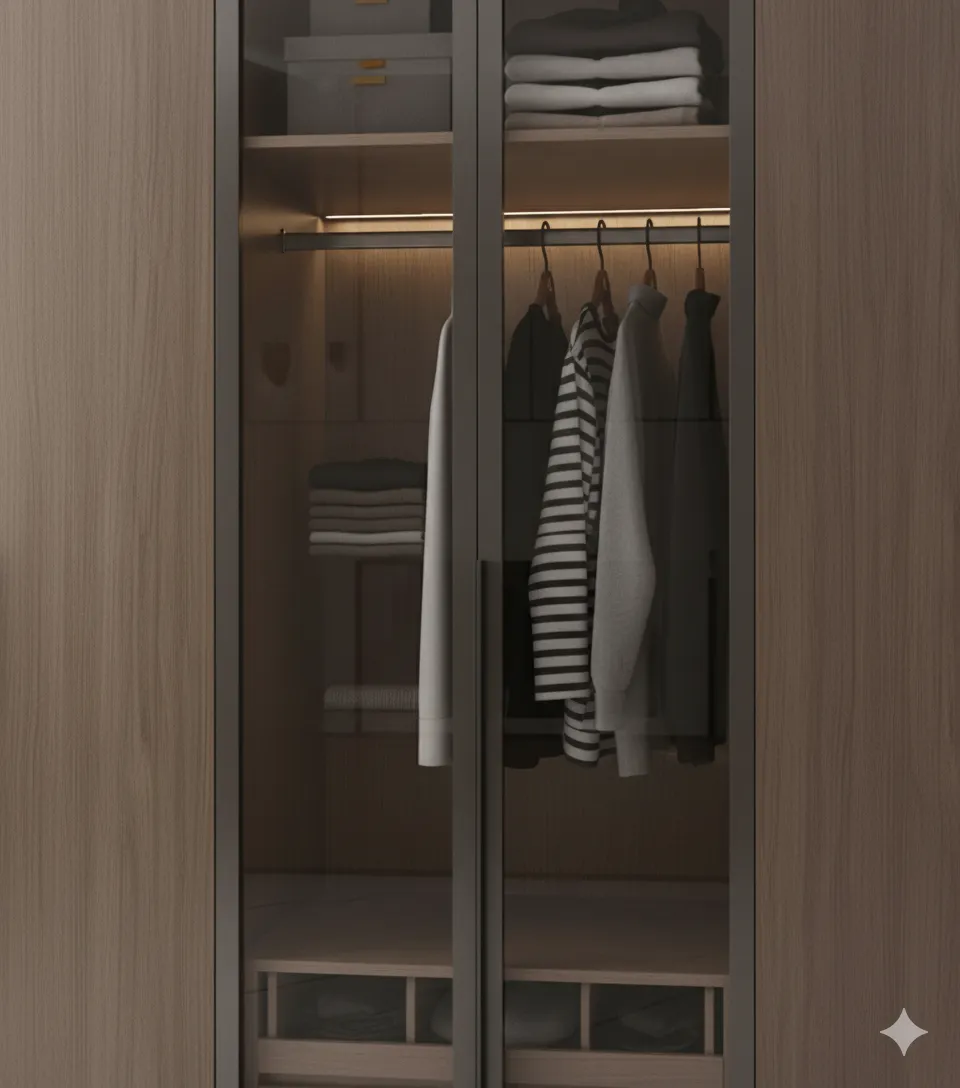 تأتي بواجهات خشبية أنيقة مع بابين زجاج فوميه يكشفان عن إضاءة داخلية دافئة تضيف لمسة فاخرة لغرفة النوم.