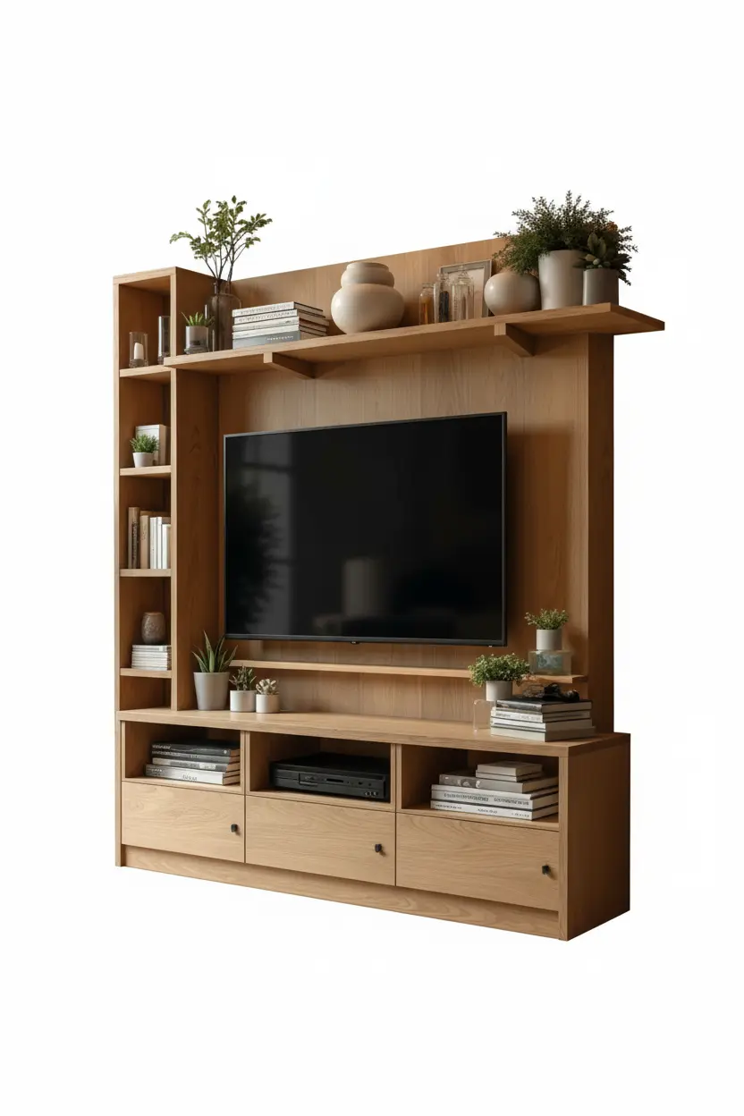 وحدة التلفزيون إلورا مودرن بلون خشبي فاتح من Living صُممت لتجمع بين الراحة البصرية والتنظيم العملي في قطعة واحدة.