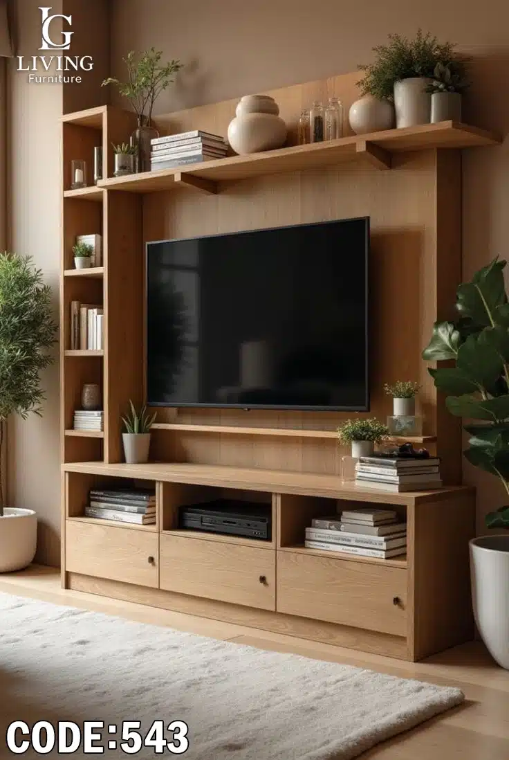 إلى جانب أرفف جانبية مفتوحة لوضع الكتب والإكسسوارات، ورف علوي عريض يسمح بعرض النباتات أو قطع الديكور المميزة.