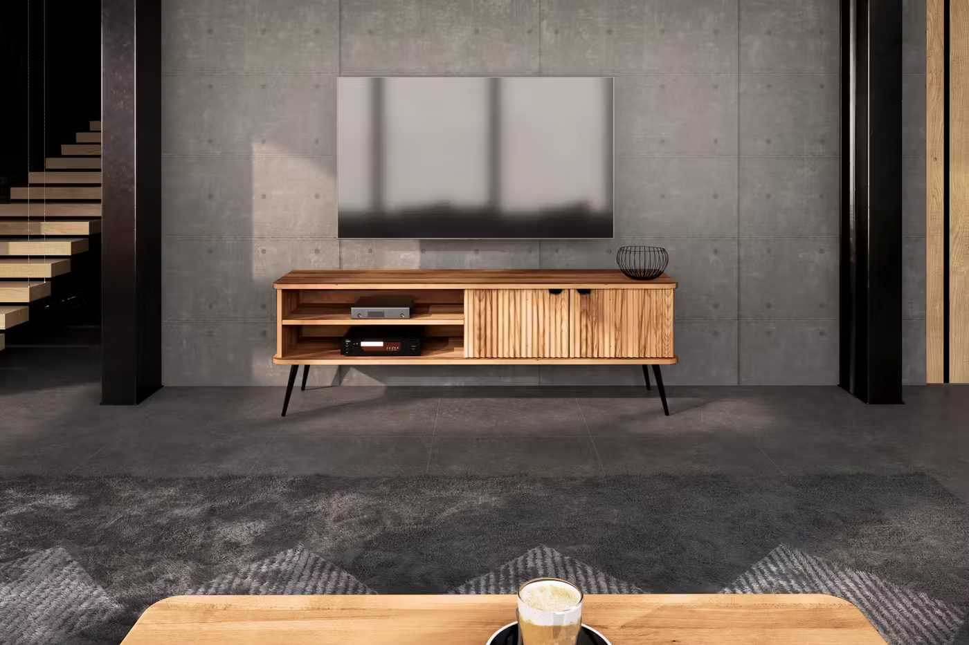 - رف مفتوح متعدد الاستخدام: لوضع وحدات الميديا، مشغلات الوسائط، الكتب، أو عناصر الزينة.