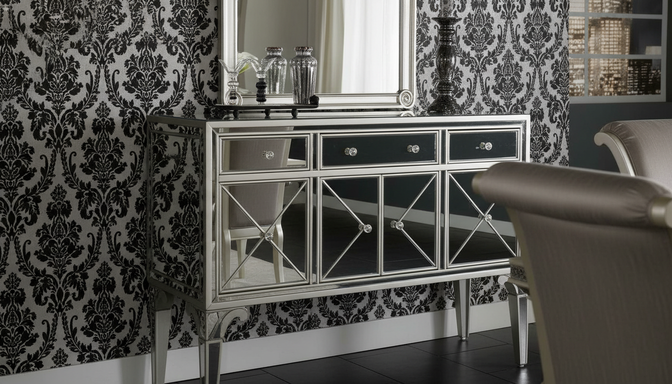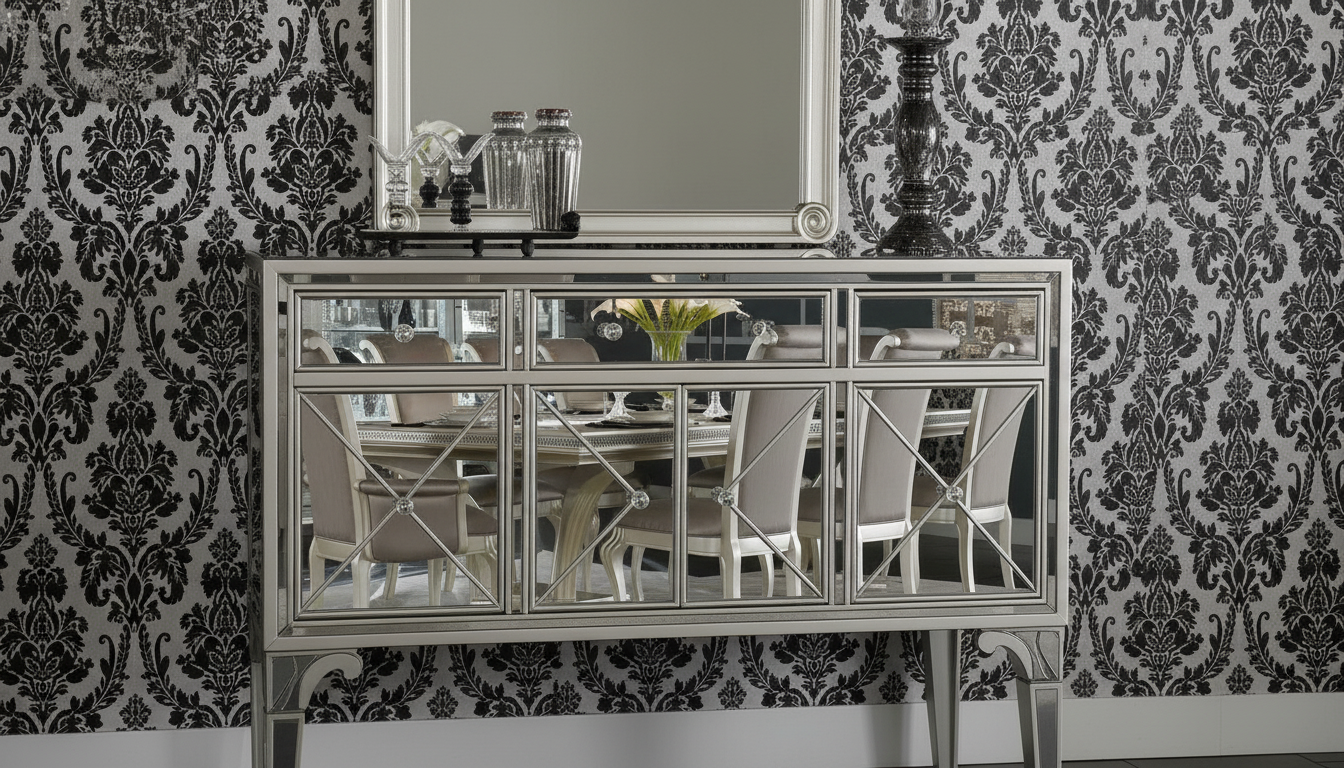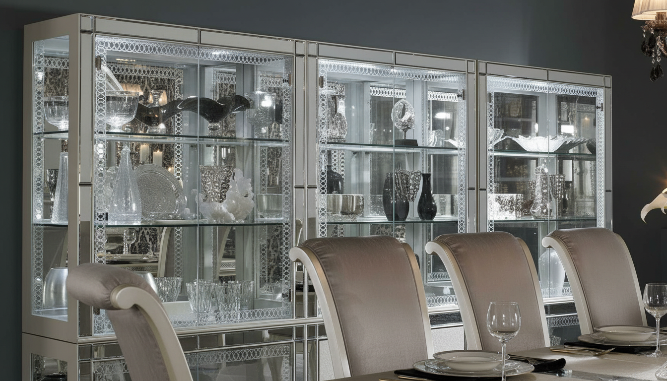 ويكتمل المشهد مع نيش زجاجي أنيق يسمح بعرض أطقم السفرة والكريستال بشكل جذاب، ليجعل غرفة الطعام نقطة جذب أساسية في منزلك.