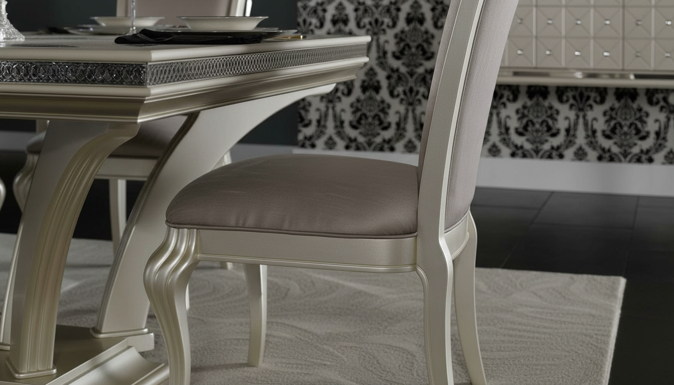 الطاولة مصممة لتجمع بين الجمال والعملية، مع سطح متين سهل التنظيف، بينما توفر الكراسي المبطنة راحة عالية بفضل التنجيد الفاخر والدعم المثالي للظهر.
