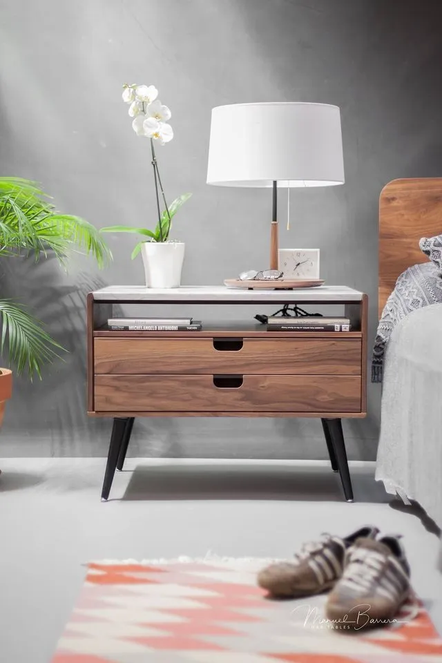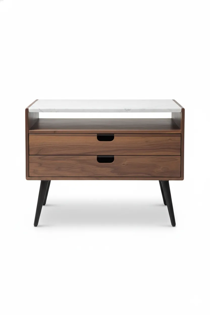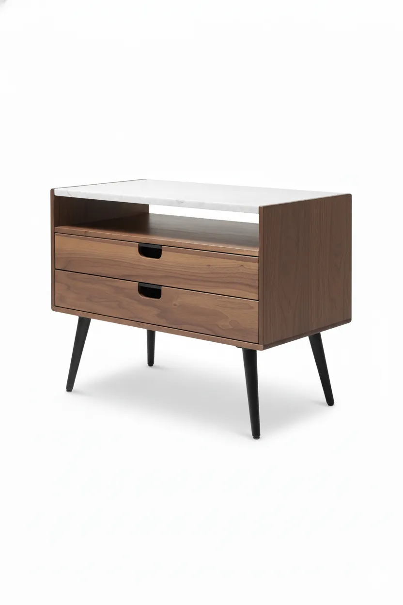 مزود بدرجين للتخزين مع فتحة سحب مدمجة لمظهر نظيف وأنيق، وأرجل معدنية مائلة باللون الأسود تمنح ثباتًا وشكلًا حديثًا.