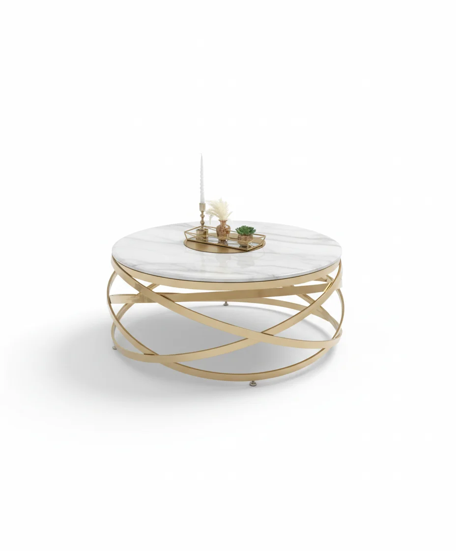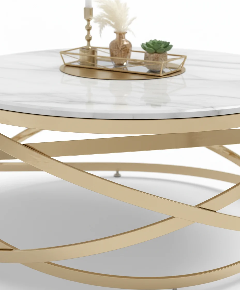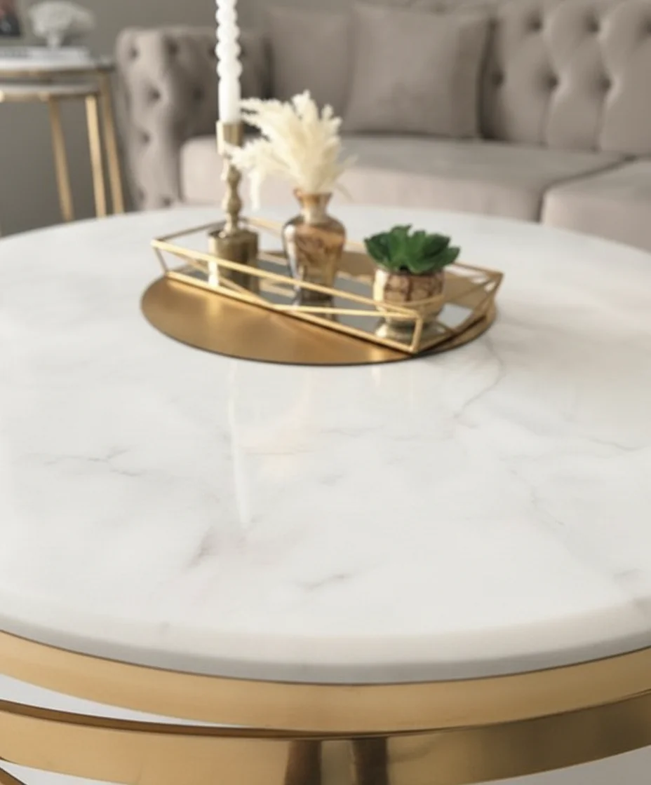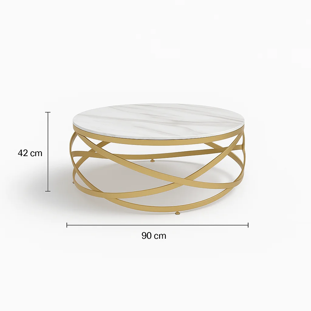 تأتي بسطح من الرخام الأبيض الطبيعي الفاخر مع قاعدة من المعدن الذهبي اللامع بتصميم متشابك مميز يمنحها مظهراً حديثاً وجذاباً.