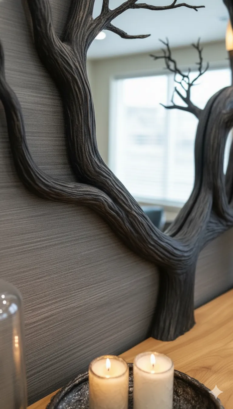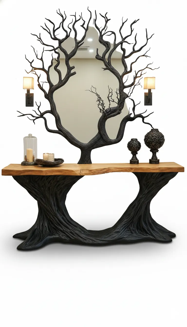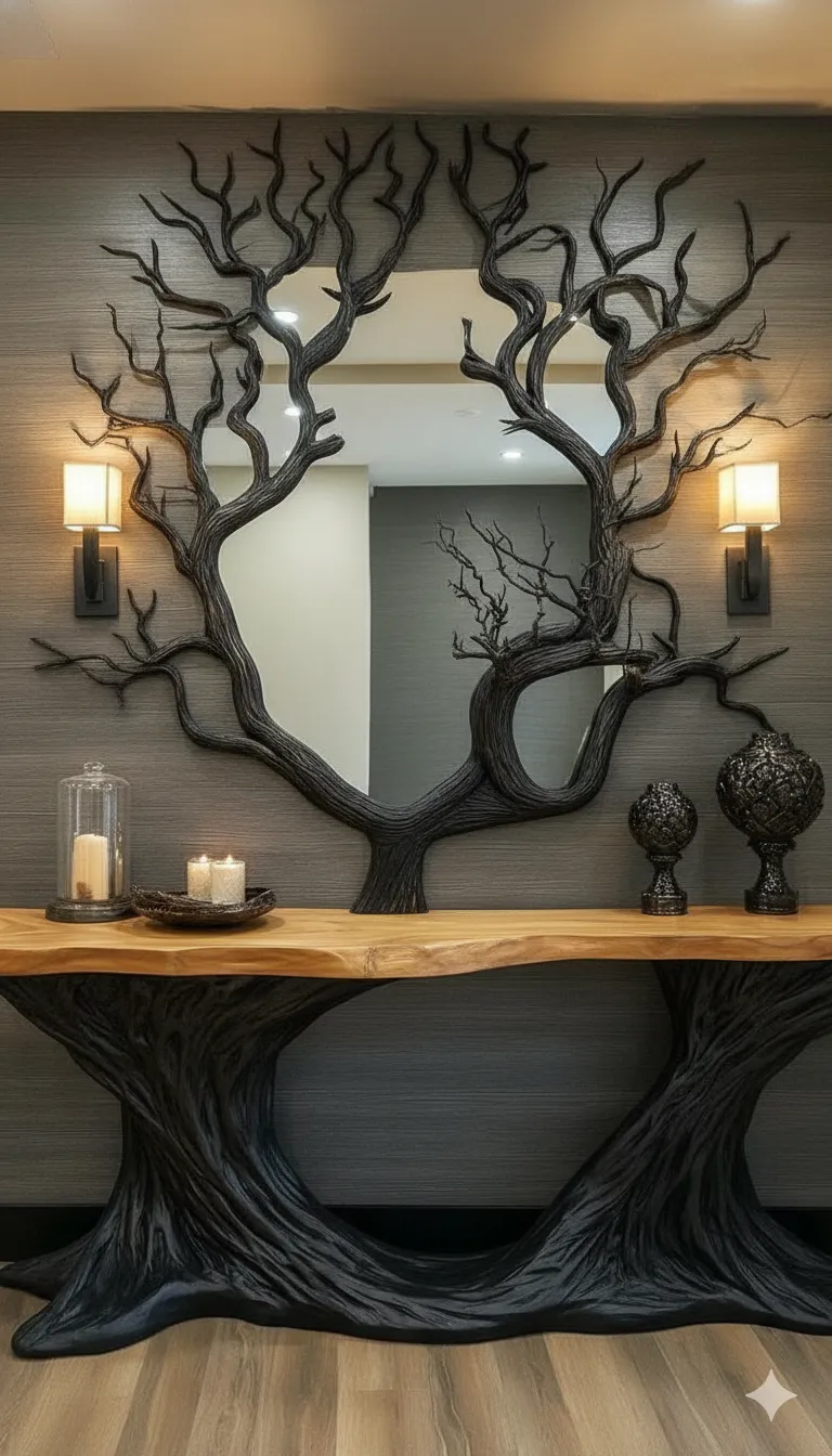 المرآة العلوية مستوحاة من فروع الأشجار المتشابكة، بنحت دقيق يعكس الضوء ويضيف عمقًا بصريًا رائعًا للمكان، مما يجعله قطعة ديكور مثالية للمدخل أو غرفة المعيشة أو الفيلات الراقية.
