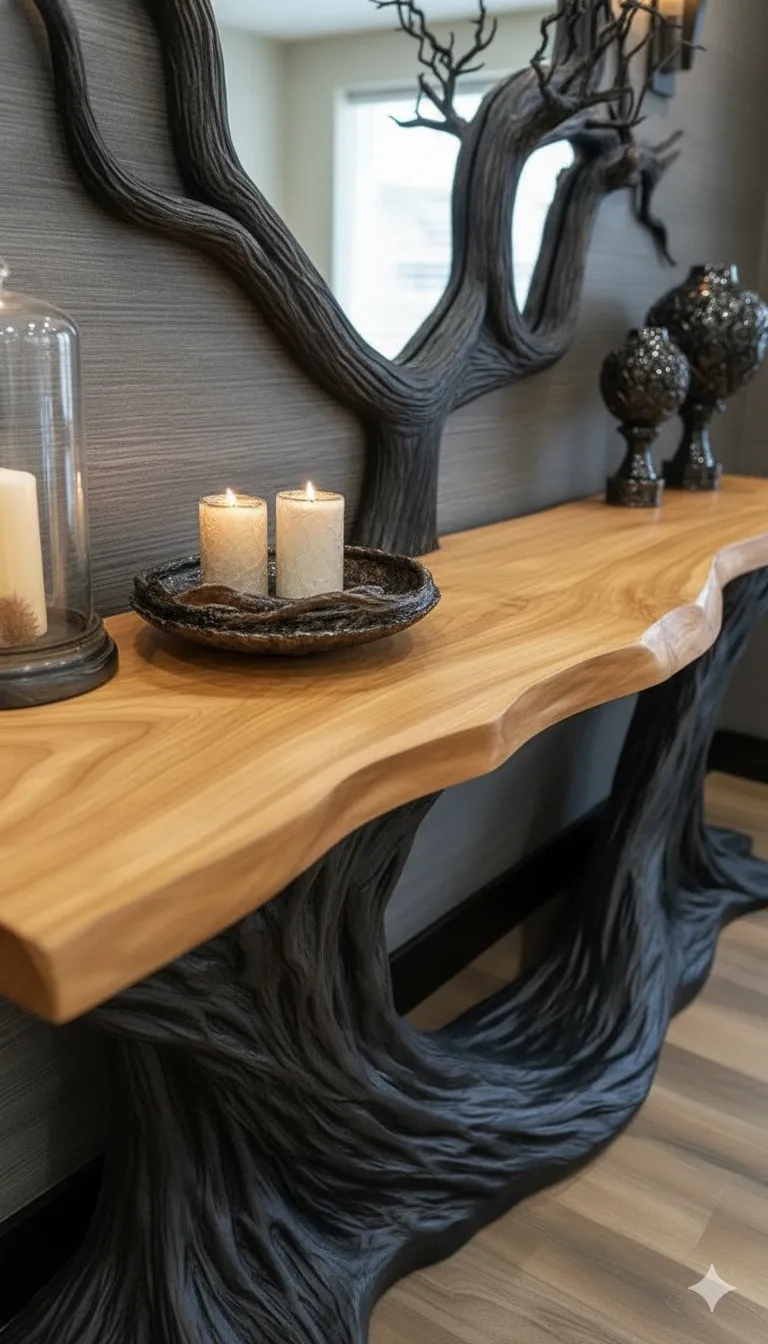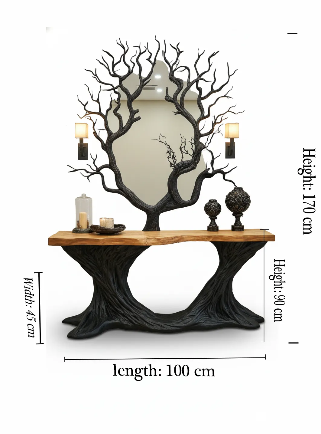 إيلاف كونسول شجرة بتصميم فني فاخر يجمع بين الحرفية العالية والطابع الطبيعي، حيث يأتي بقاعدة منحوتة على شكل جذوع شجر متداخلة تمنح إحساسًا بالقوة والثبات. السطح العلوي مصنوع من الخشب الطبيعي بملمس دافئ وحافة غير منتظمة تزيد من جمال التصميم.