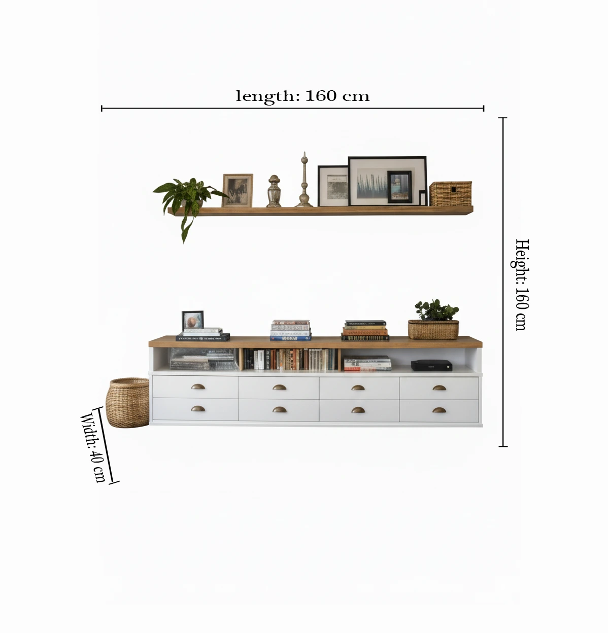 إيما وحدة تلفزيون مودرن بخزائن تخزين ورف علوي من LIVING تجمع بين الأناقة العملية والتصميم العصري.تتميز بخزائن متعددة ورف جداري أنيق لتزيين الحائط بعناصر ديكور أو كتب، مع سطح خشبي قوي يضفي دفئًا على الغرفة.الأبعاد: الطول 160 سم × الارتفاع 160 سم × العرض 40 سم – مثالية لغرف المعيشة الحديثة.