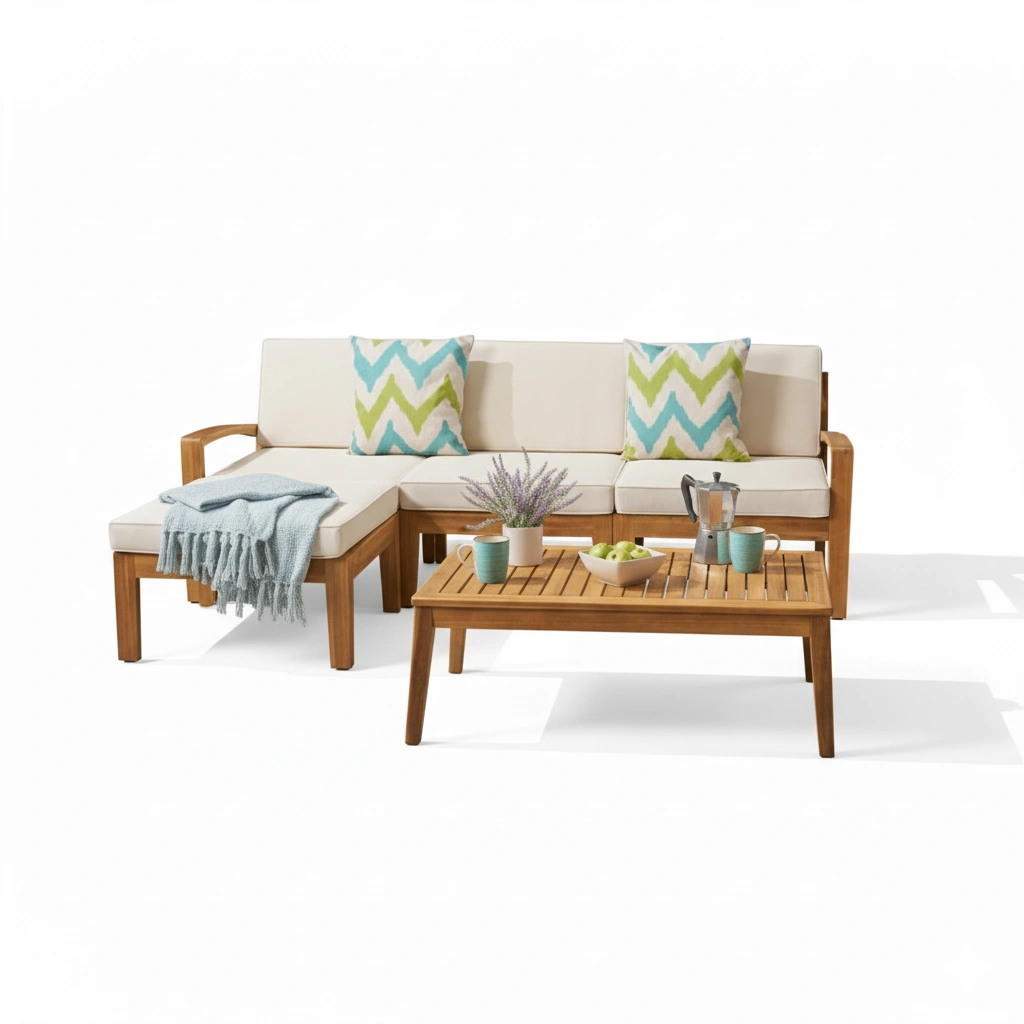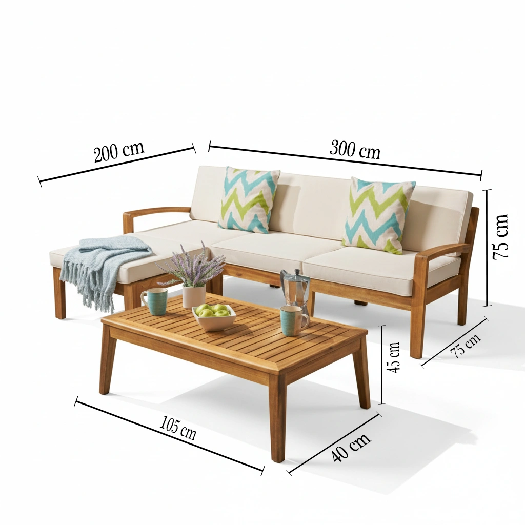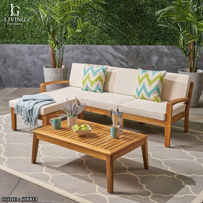 بروفانس من LIVING طقم أثاث خارجي بتصميم عصري وألوان كريمية طبيعية تضيف لمسة من الهدوء والأناقة لمساحتك.مصنوع من خشب طبيعي مقاوم للعوامل الجوية، مع وسائد مريحة باللون البيج الفاتح.الأبعاد: كنبة 300×200×75 سم ترابيزة 105×75×45 سم.