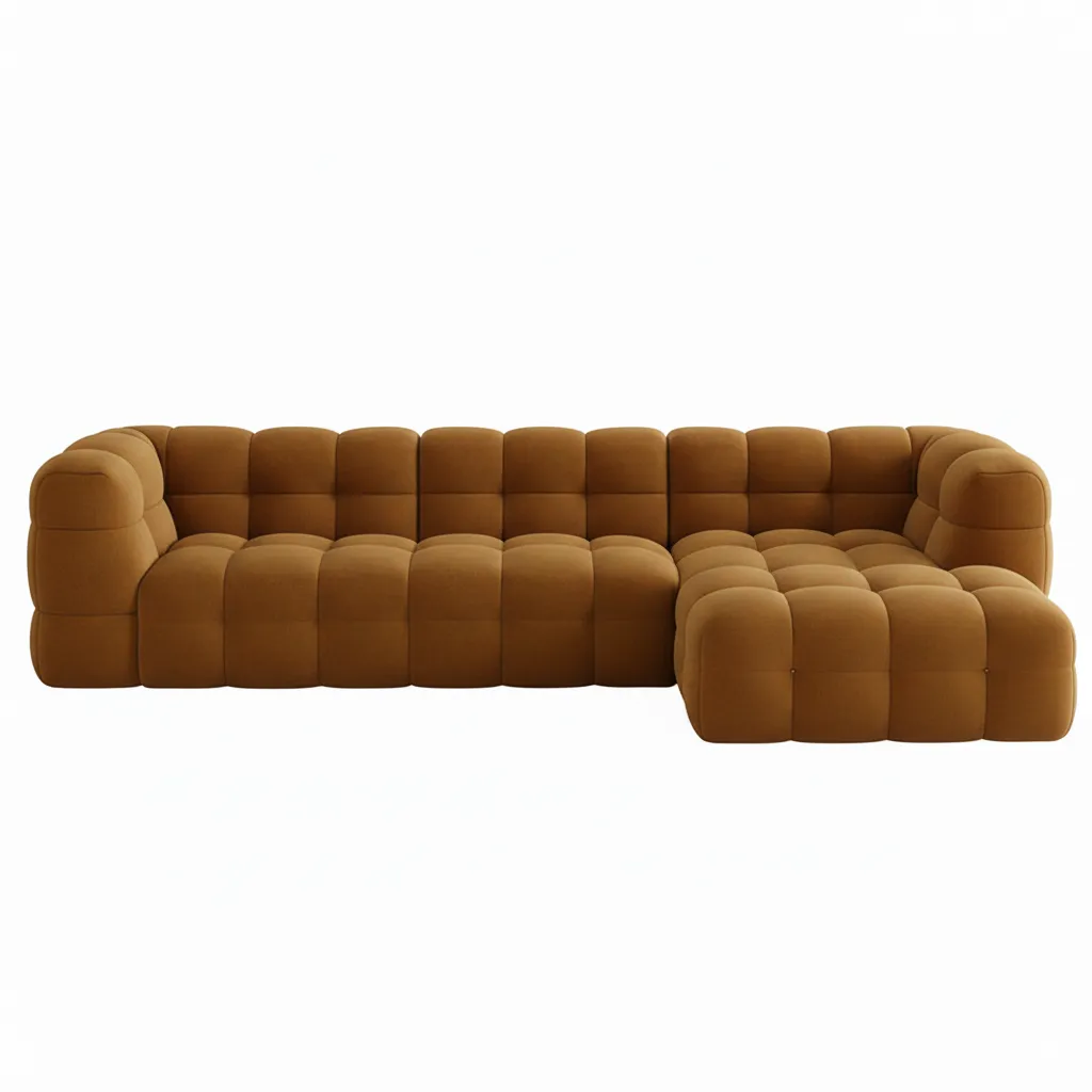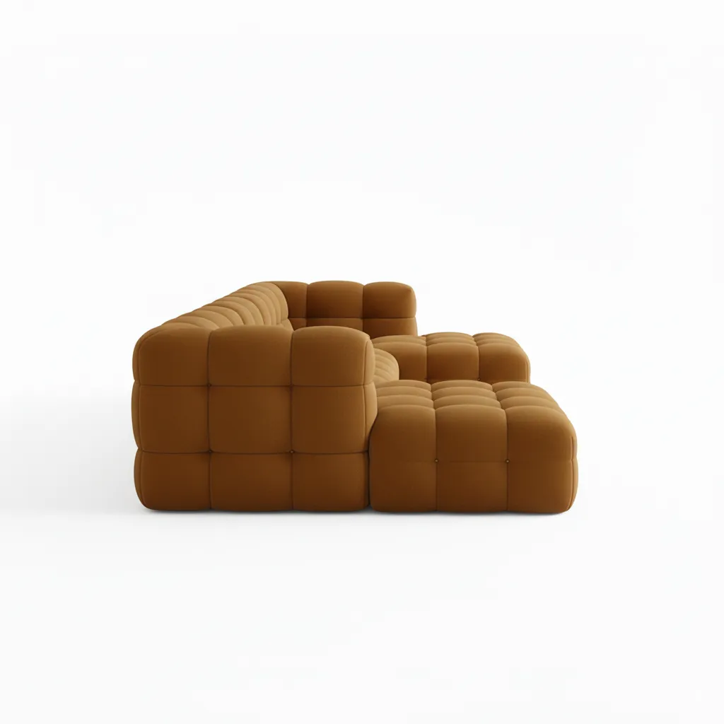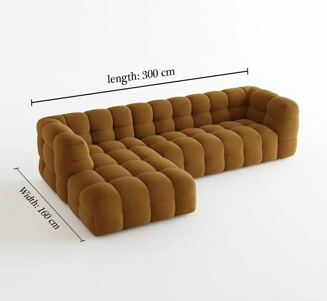 تاليا ركنة ليفينج مودرن بتصميم عصري فاخر بتجمع بين الأناقة والراحة في نفس الوقت. تصميمها المبطّن بالكامل بيديها شكل مميز يخطف العين، واللون الجملي الدافئ بيضيف إحساس بالدفء والرقي للمكان. القماش ناعم وسهل التنظيف، والوسائد السميكة بتوفر راحة استثنائية تخليك مش عايز تقوم منها.