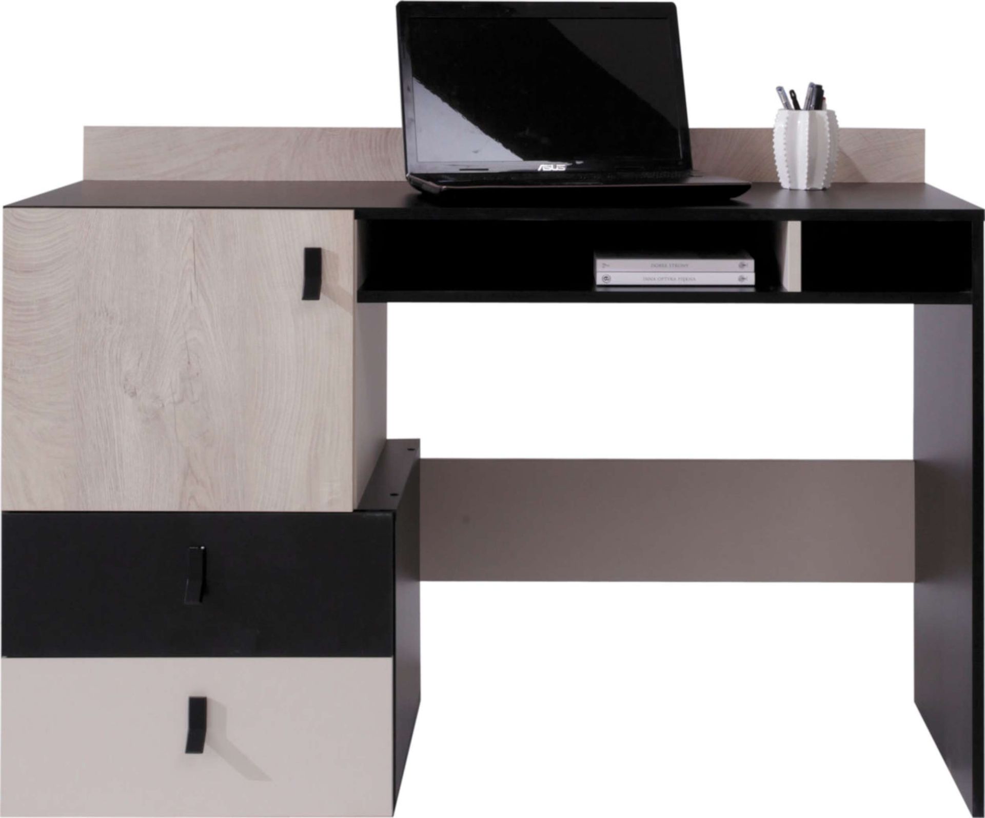 يحتوي المكتب على أدراج متعددة لتنظيم الأدوات المكتبية، بالإضافة إلى وحدة تخزين جانبية مناسبة للملفات والأغراض الأكبر حجمًا.