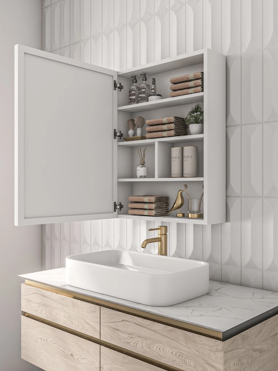 نعم، مرآة تولين مصممة للاستخدام في الحمام بفضل المواد المقاومة للرطوبة ومفصلات Soft Close التي تسهل فتح الخزانة دون التأثير على جودتها.