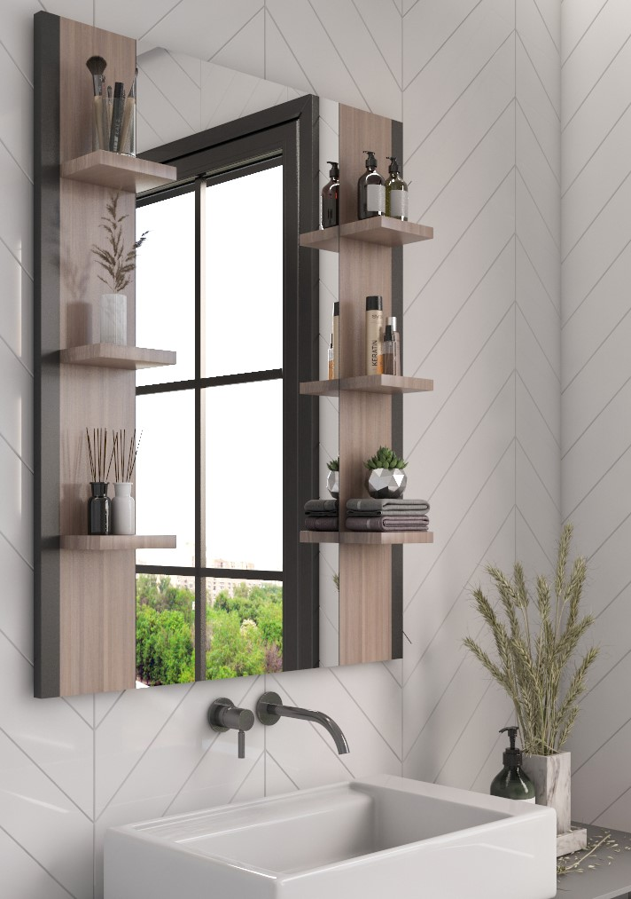 استمتع بتصميم فريد وجميل مع وحدة مرايا جيوليا متعددة الوظائف، التي تجمع بين الإطار الخشبي العصري و أرفف التخزين الجانبية لتعرض مستلزماتك الشخصية مثل أدوات العناية الشخصية والمناشف. بفضل تصنيعها من الخشب الطبيعي المقاوم للرطوبة والحرارة، فإن مرآة حمام جيوليا تضمن لك عمرًا طويلاً واستدامة عالية.