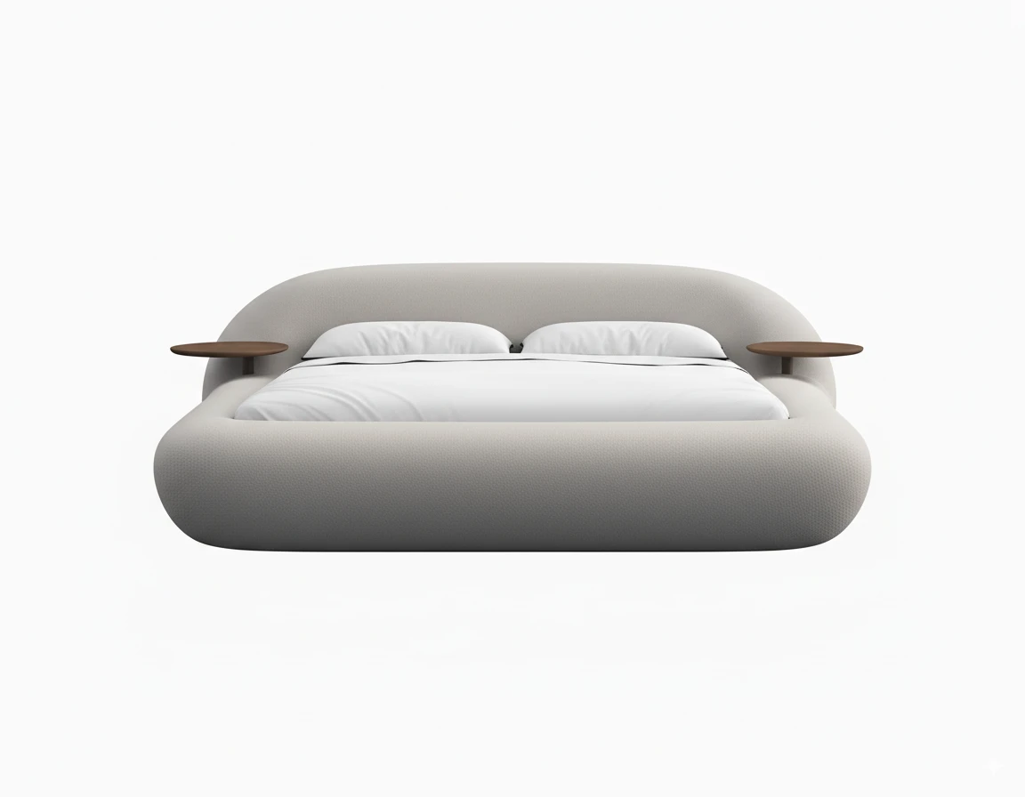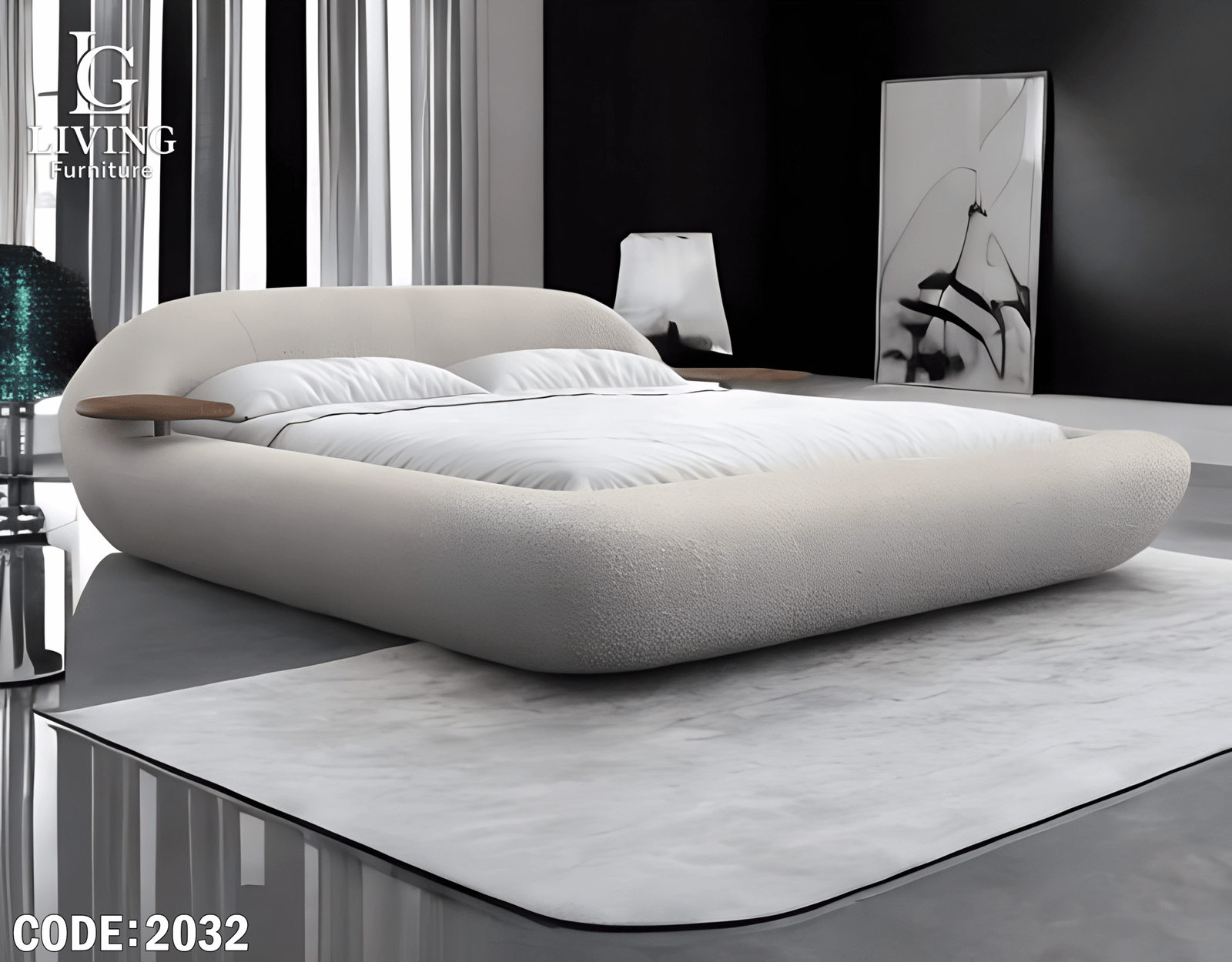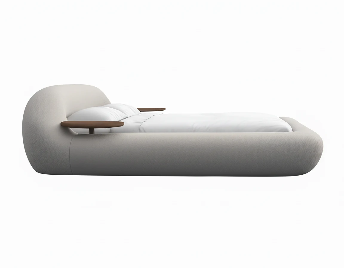 السرير مصنوع بخطوط منحنية انسيابية تضفي إحساسًا بالدفء والهدوء داخل الغرفة، مع ذراعين جانبيين خشبيين يوفران لمسة من الأناقة والوظيفية في آنٍ واحد.