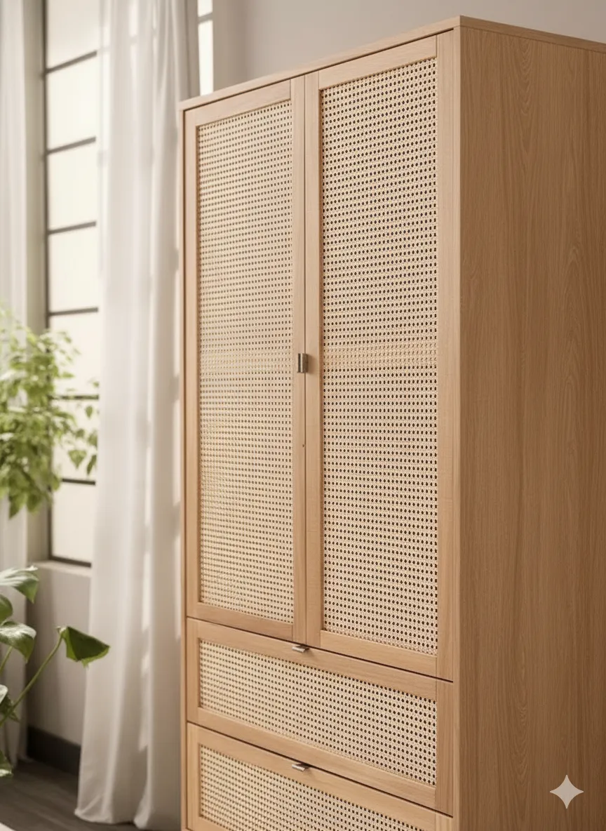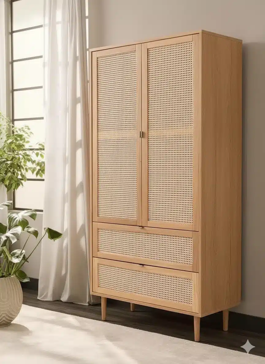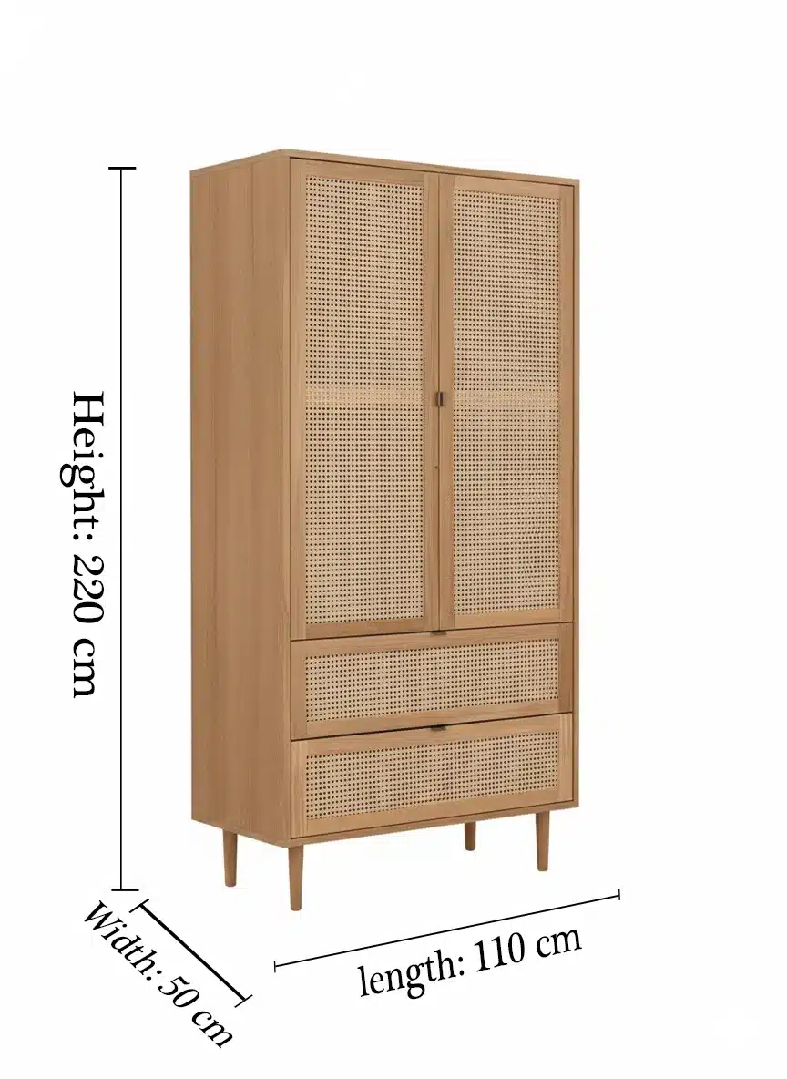 استمتع بشكل راقٍ مع راوندا خزانة خشبية بواجهة رتان مودرن، التي تجمع بين التصميم الطبيعي الدافئ والعملية العالية. الواجهة المصنوعة من راتان طبيعي تعزز التهوية الداخلية وتحافظ على رائحة الملابس، بينما يمنحك القسم الداخلي مساحة كافية لتعليق الملابس وتخزين القطع المطوية داخل درجين واسعين.