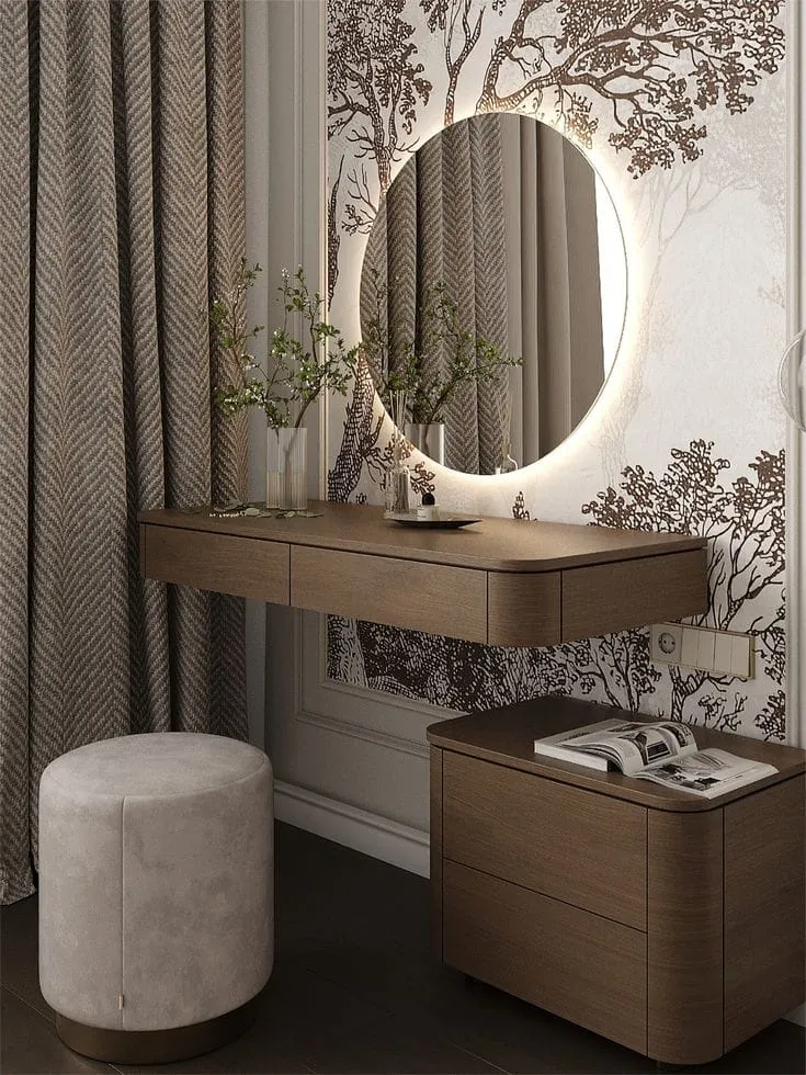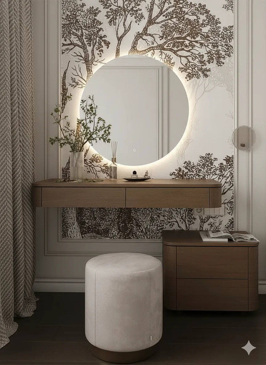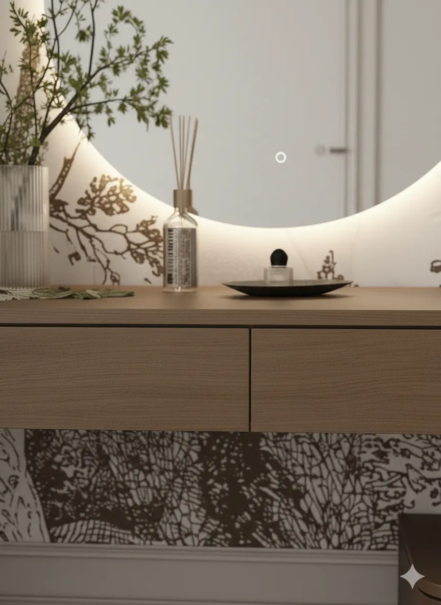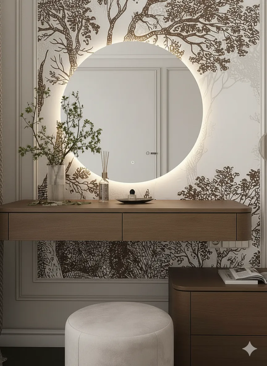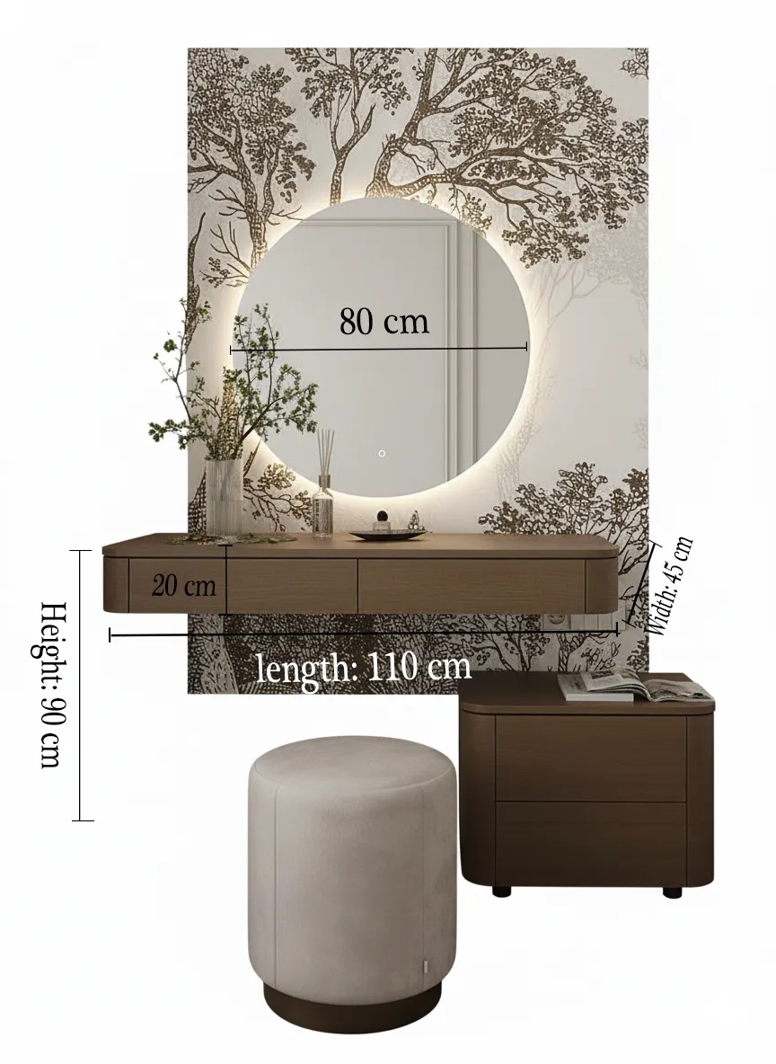روفـيــان تسريحة معلّقة بتفاصيل راقية ولمسة عصرية تجمع بين الخشب الدافئ والإضاءة المحيطية المميزة التي تضيف لمسة من الفخامة والهدوء للمساحة. تأتي بمرايا دائرية بإضاءة ناعمة تمنح انعكاسًا مثاليًا وأجواء مريحة أثناء الاستخدام، مع وحدة تخزين عملية بتشطيب أنيق. مناسبة لغرف النوم المودرن وتُضفي لمسة ديكورية جذابة بفضل انسيابية التصميم وتكامل الخامات.