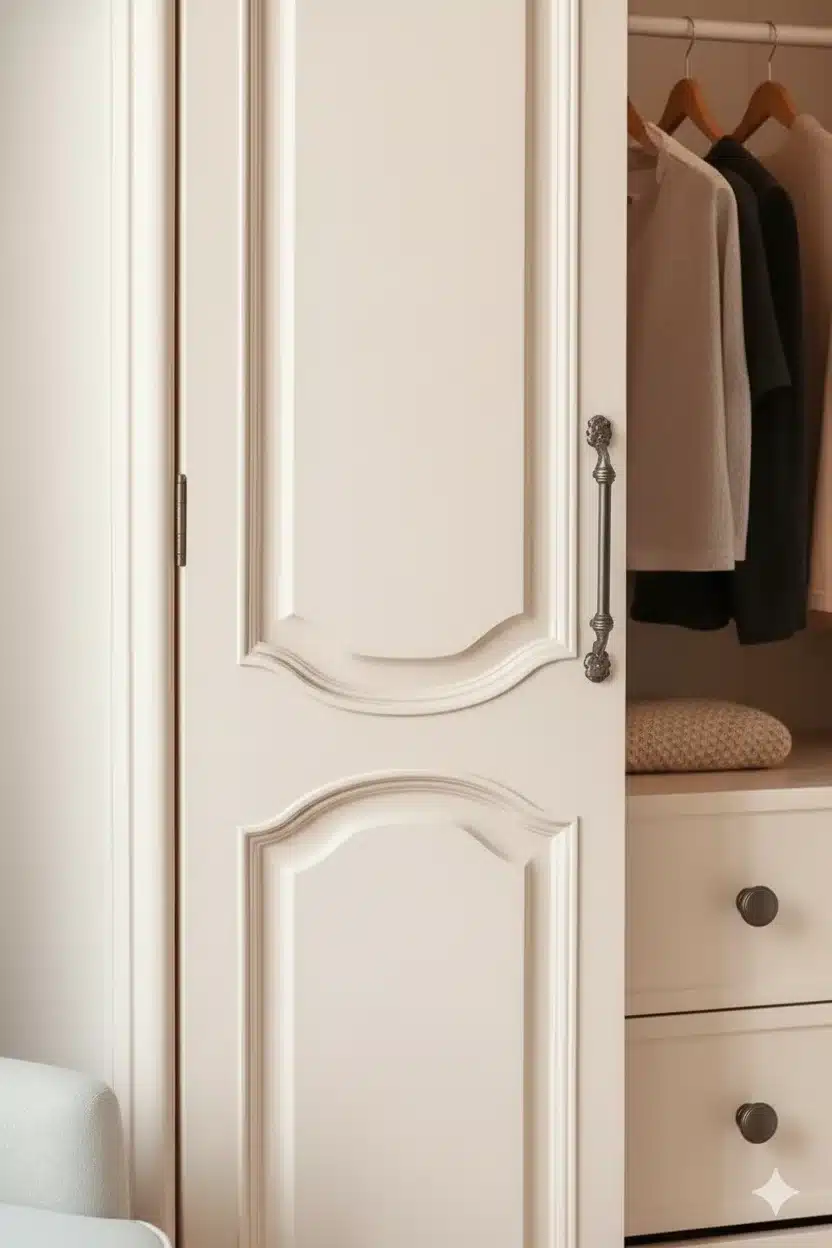 اللون الأوف-وايت الفاتح يمنح الخزانة حضوراً هادئاً ومتناغماً يناسب جميع ديكورات غرف النوم.