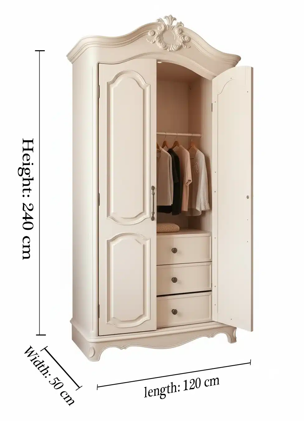 روما كلاسيك خزانة ملابس مزخرفة راقية خزانة ملابس كلاسيكية راقية بتصميم مزخرف، ارتفاع 240 سم × عرض 120 سم × عمق 50 سم، مصنوعة من خشب متين بلون أوف-وايت أنيق مع أدراج داخلية عملية.
