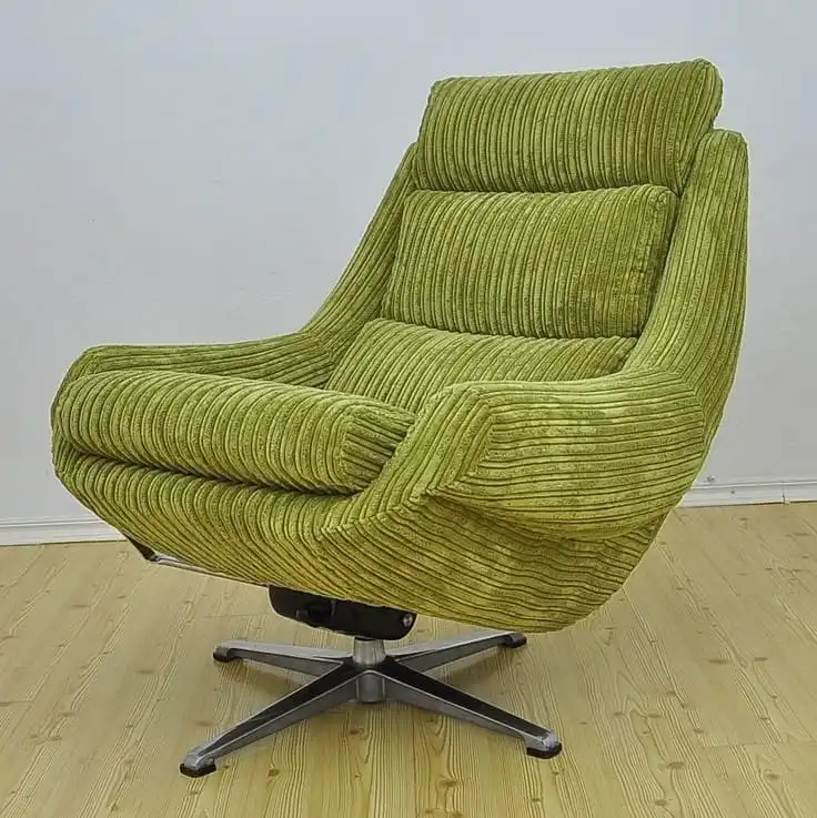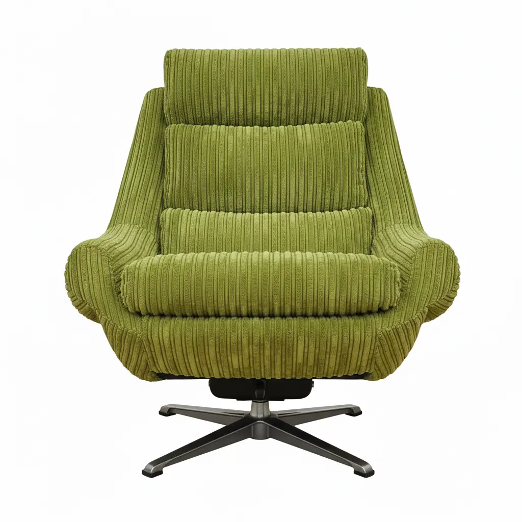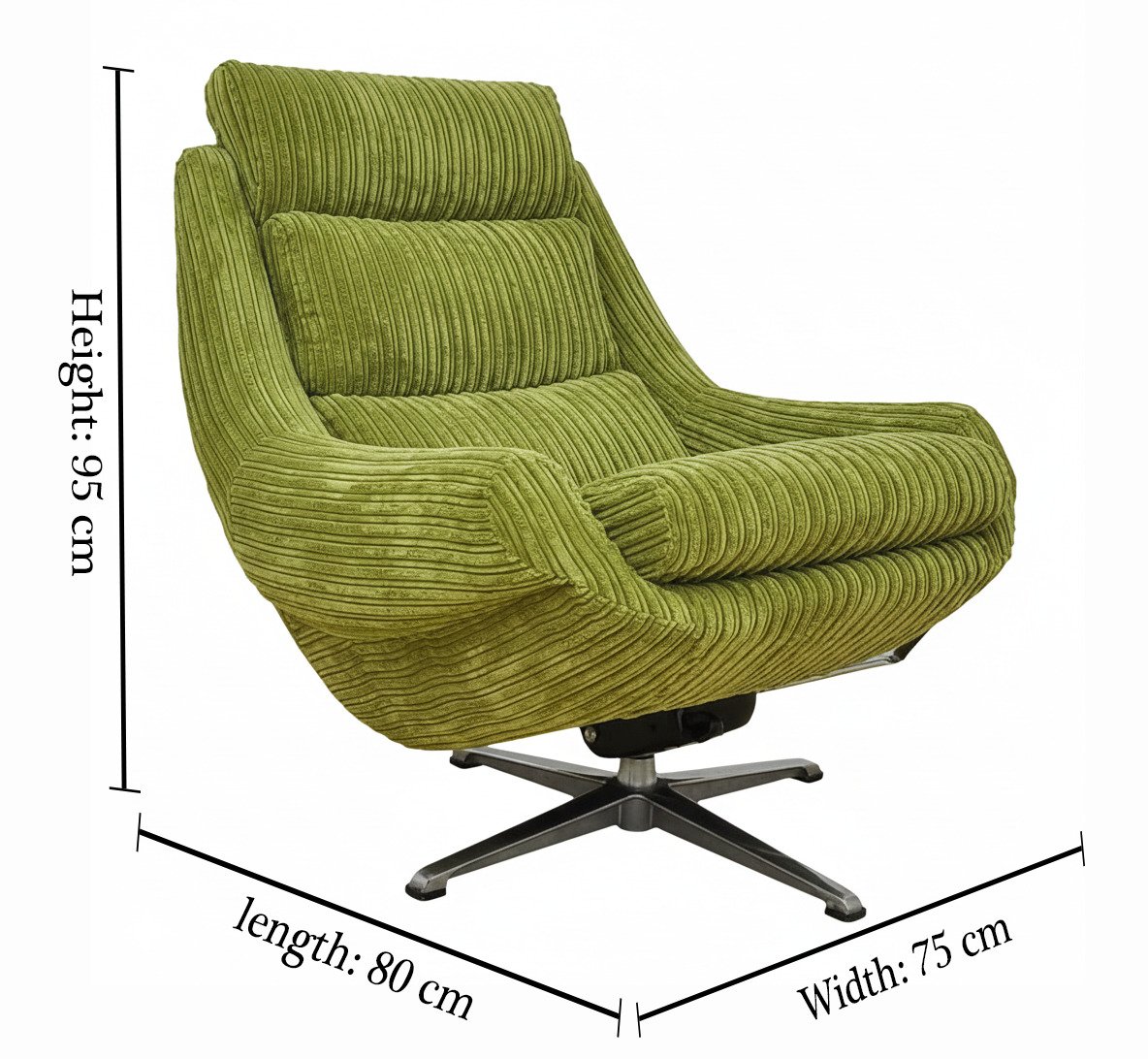 يتميز الكرسي بقاعدة معدنية دوّارة تمنحك حرية الحركة بكل سلاسة، مع وسائد سميكة مغطاة بقماش مخملي فاخر مخطط باللون الأخضر الحيوي الذي يضفي لمسة طبيعية منعشة على الديكور.