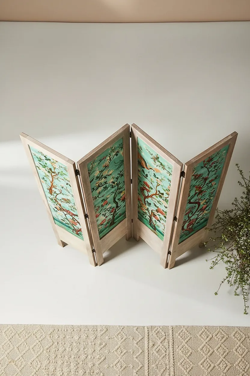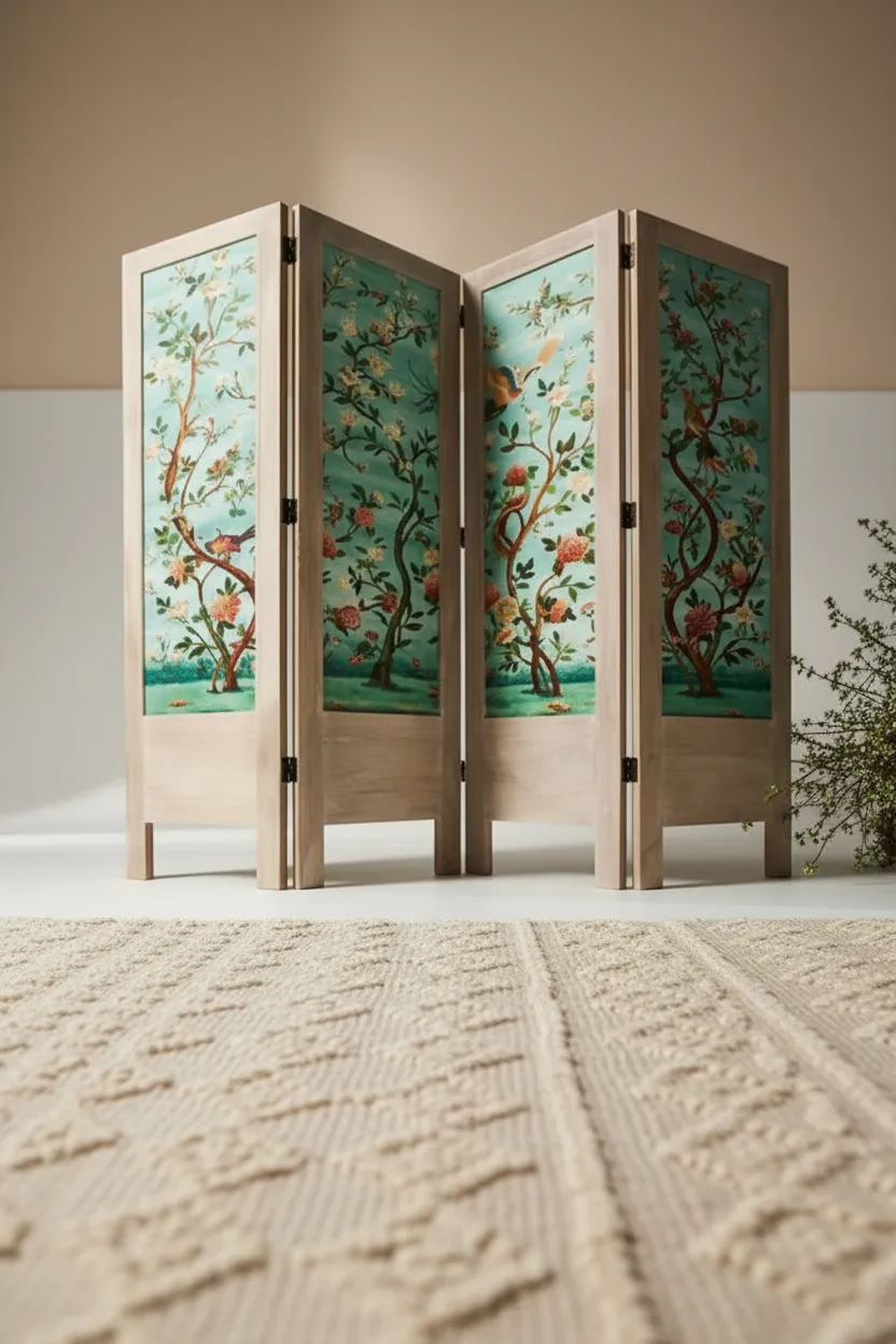 سامارا برافان خشبي مزخرف بزهور وطيور مستوحاة من الطبيعة، تصميم فني أنيق يمنح غرف المعيشة والنوم والأركان الخاصة لمسة دفء وجمال بصري، مع إمكانية طيّه بسهولة للتخزين أو النقل، مما يجعله قطعة ديكور عملية وفاخرة في الوقت نفسه.