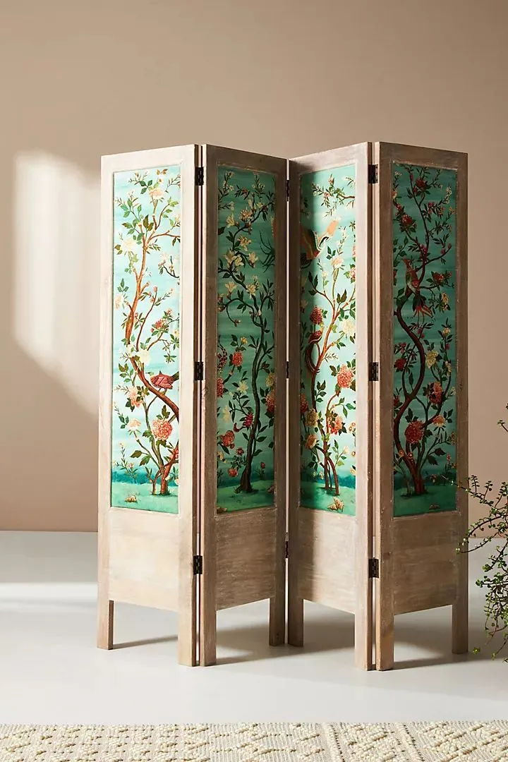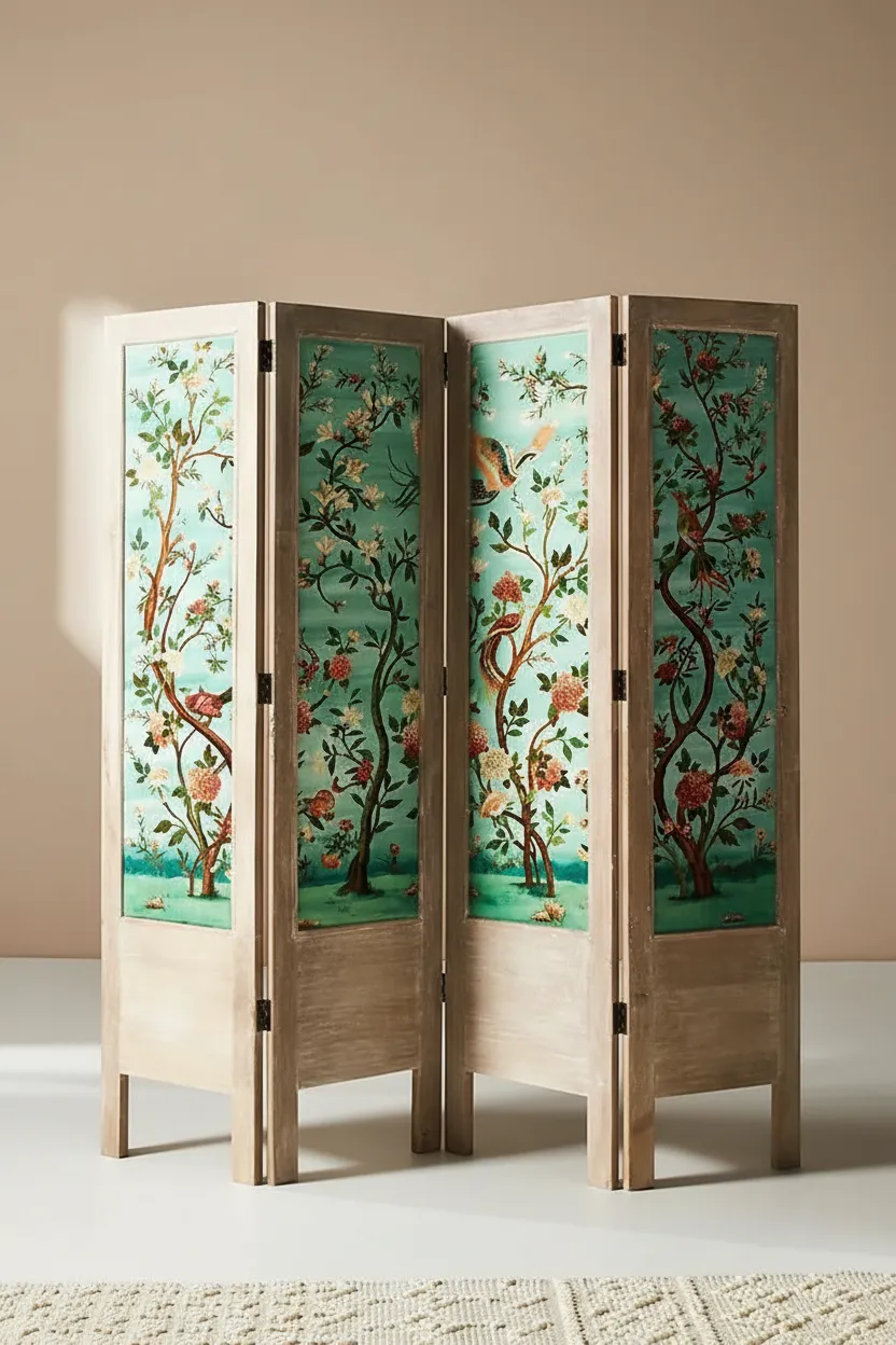 برافان خشبي مزخرف مستوحى من الطبيعة، يأتي برسومات طيور وزهور تضيف لمسة فنية راقية وتساعد في تحديد الخصوصية داخل المساحات.