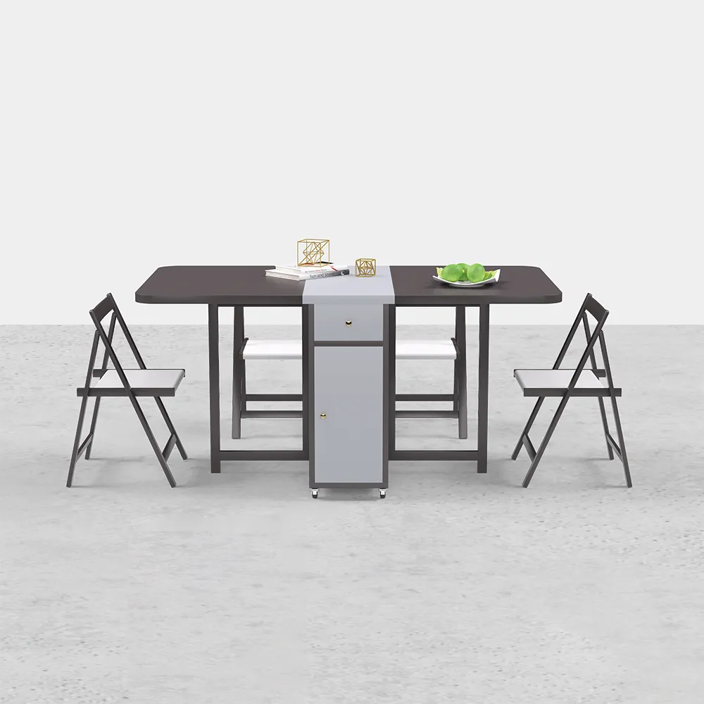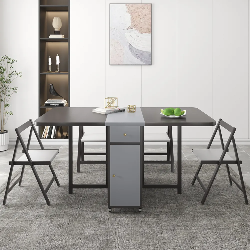 هل تبحث عن طاولة طعام ذات تصميم عملي ومميزة في الشكل! إليك هذه الطاولة المستطيلة مع أربعة مقاعد، جميع القطع قابلة للطي لذا فهي اختيار مثالي للمساحات الصغيرة خاصة. يتناسب مزيج اللونين الرمادي والأسود مع جميع أنواع الديكور الحديث.