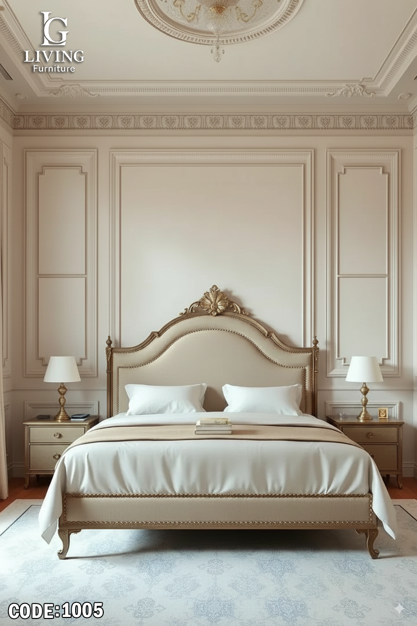 السرير يجمع بين التنجيد الناعم والهيكل الخشبي المتين المزود بزخارف ذهبية أنيقة، مع تاج علوي منحوت يعكس الفخامة الكلاسيكية. تصميمه يمنحك راحة استثنائية وأناقة خالدة تضيف رقيًا خاصًا لأي غرفة نوم.