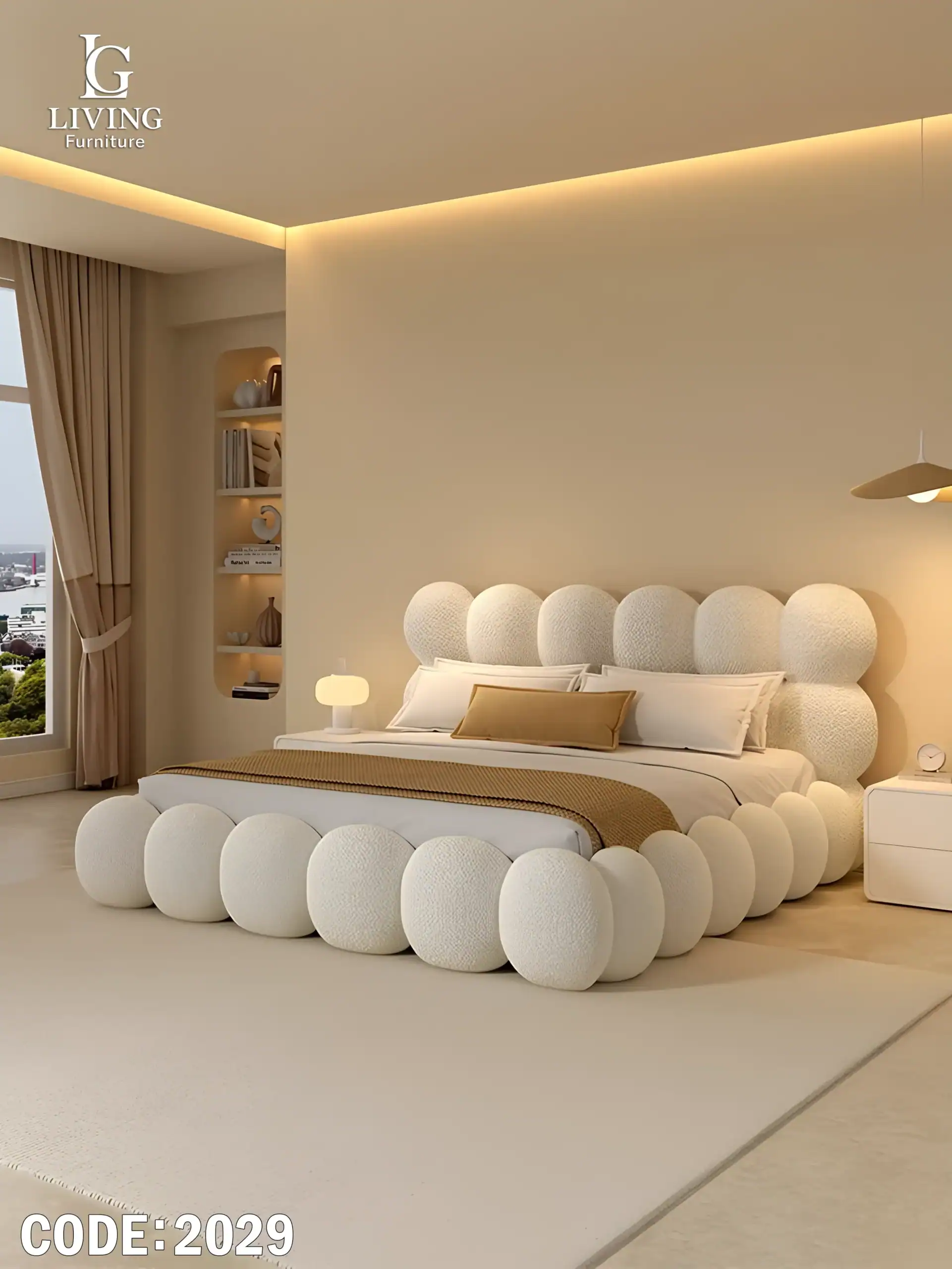 يتميز السرير بتصميم بابلز كروي فريد من نوعه يمنح الغرفة لمسة عصرية مبهرة، مع تنجيد ناعم وفاخر يضيف شعورًا بالراحة المطلقة. تم تصميمه بعناية ليجمع بين الشكل المميز والدعم المثالي للجسم، ليمنحك إحساسًا بالاسترخاء طوال الليل.