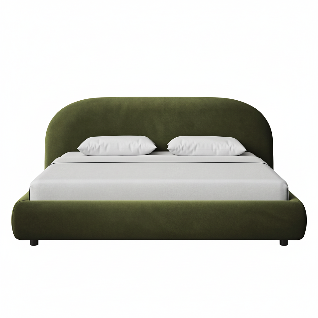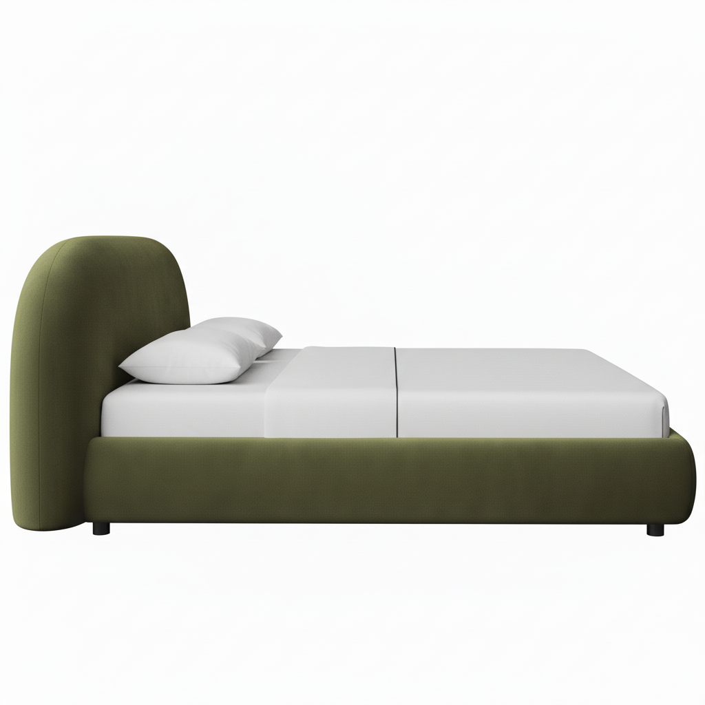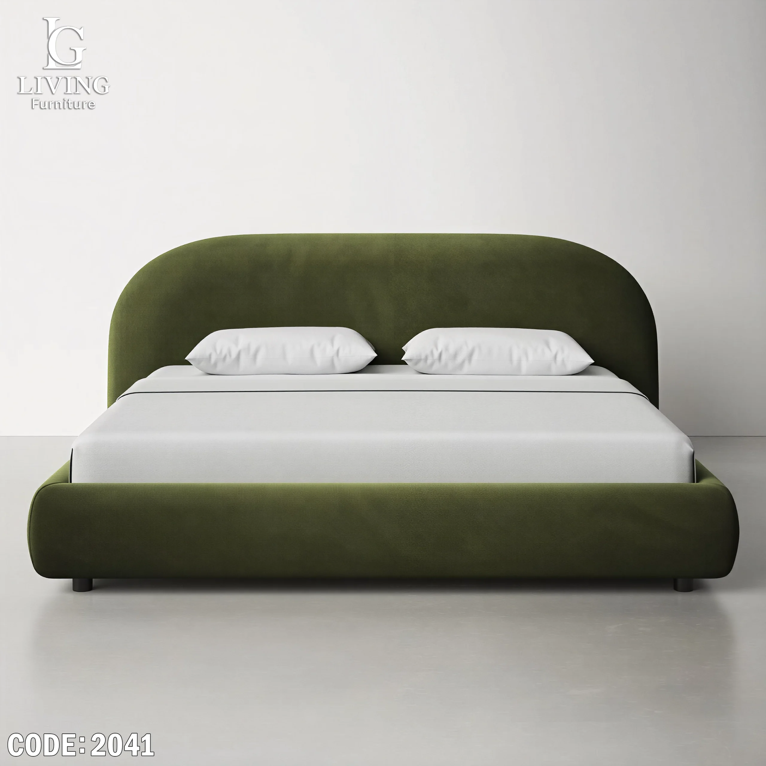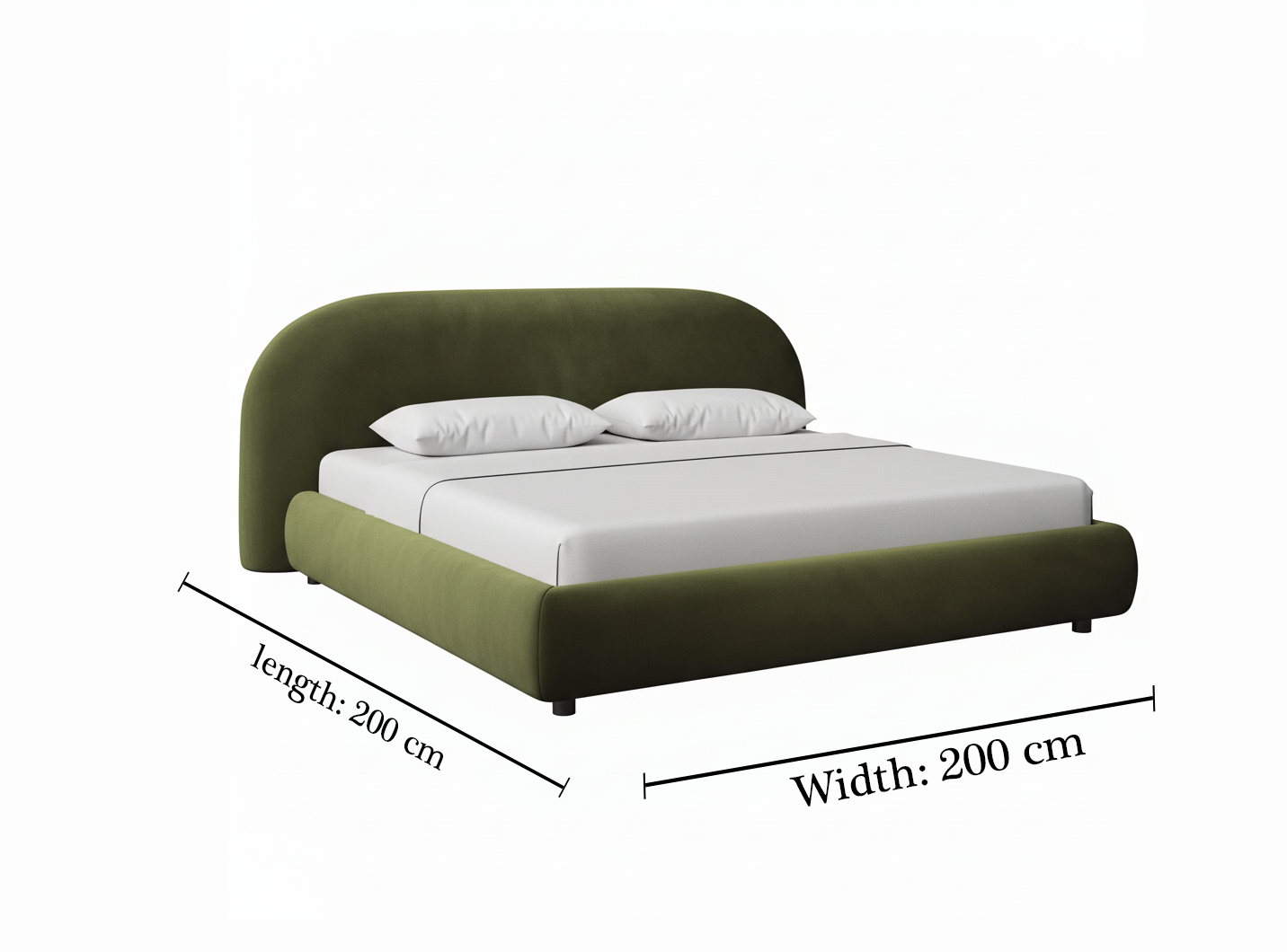 يتميز بهيكل منجد بالكامل بخطوط منحنية ناعمة تضيف إحساسًا بالدفء والراحة، مع خامة قماش مخملي أنيق باللون الزيتي الفاخر الذي يضفي لمسة ملوكية على غرفة النوم.