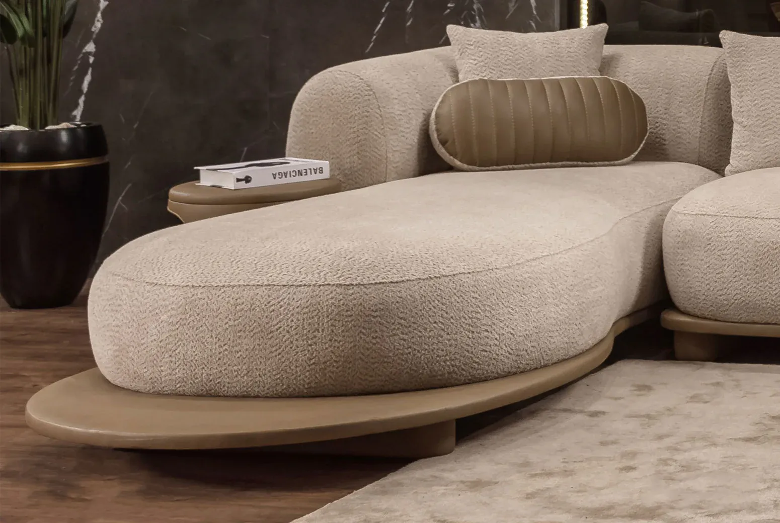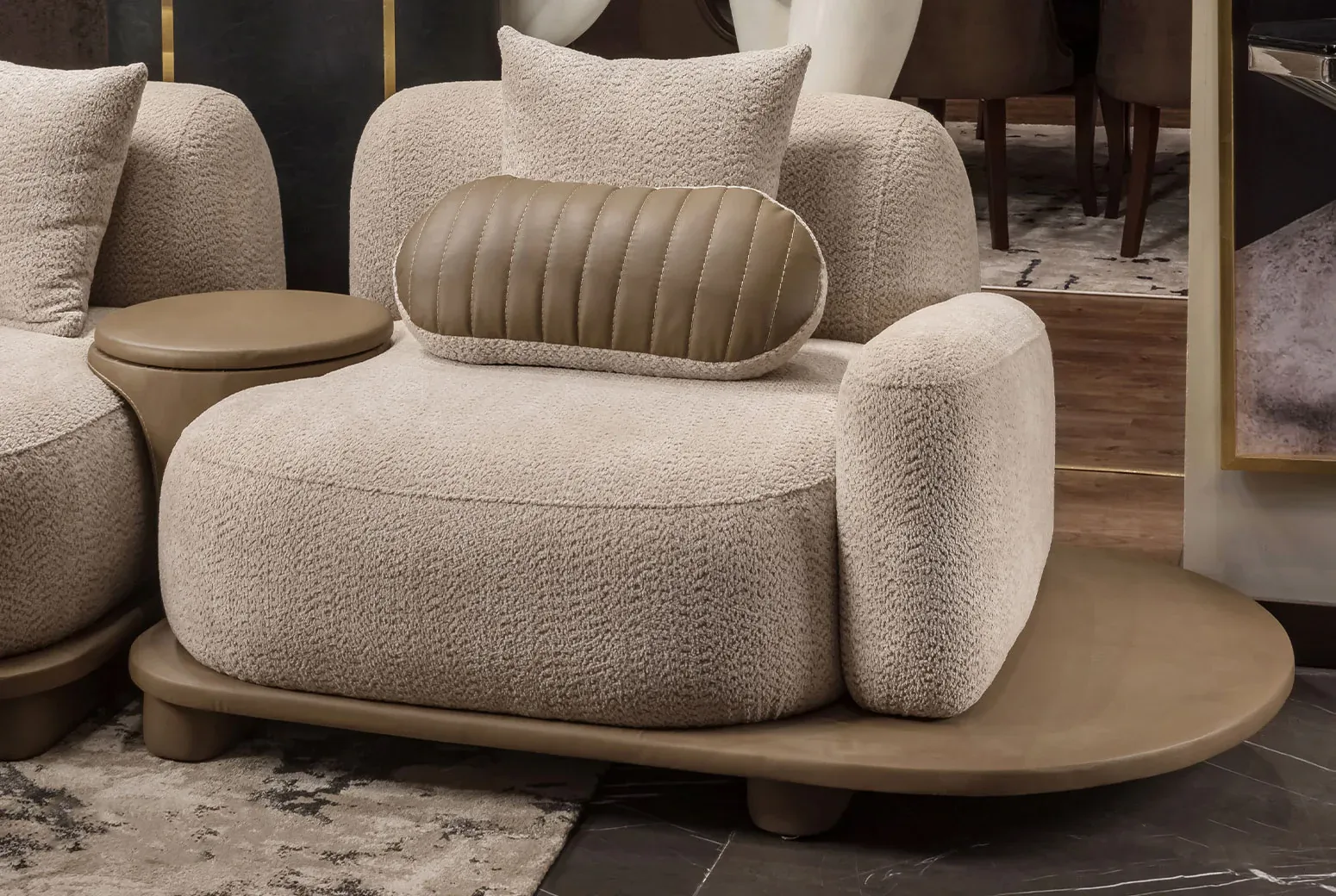 صالون مودرن فاخر بتنجيد بوكلية ناعمة ولمسة راحة فريدة، يمنح غرفة المعيشة طابعًا هادئًا وإحساسًا بالفخامة اليومية.